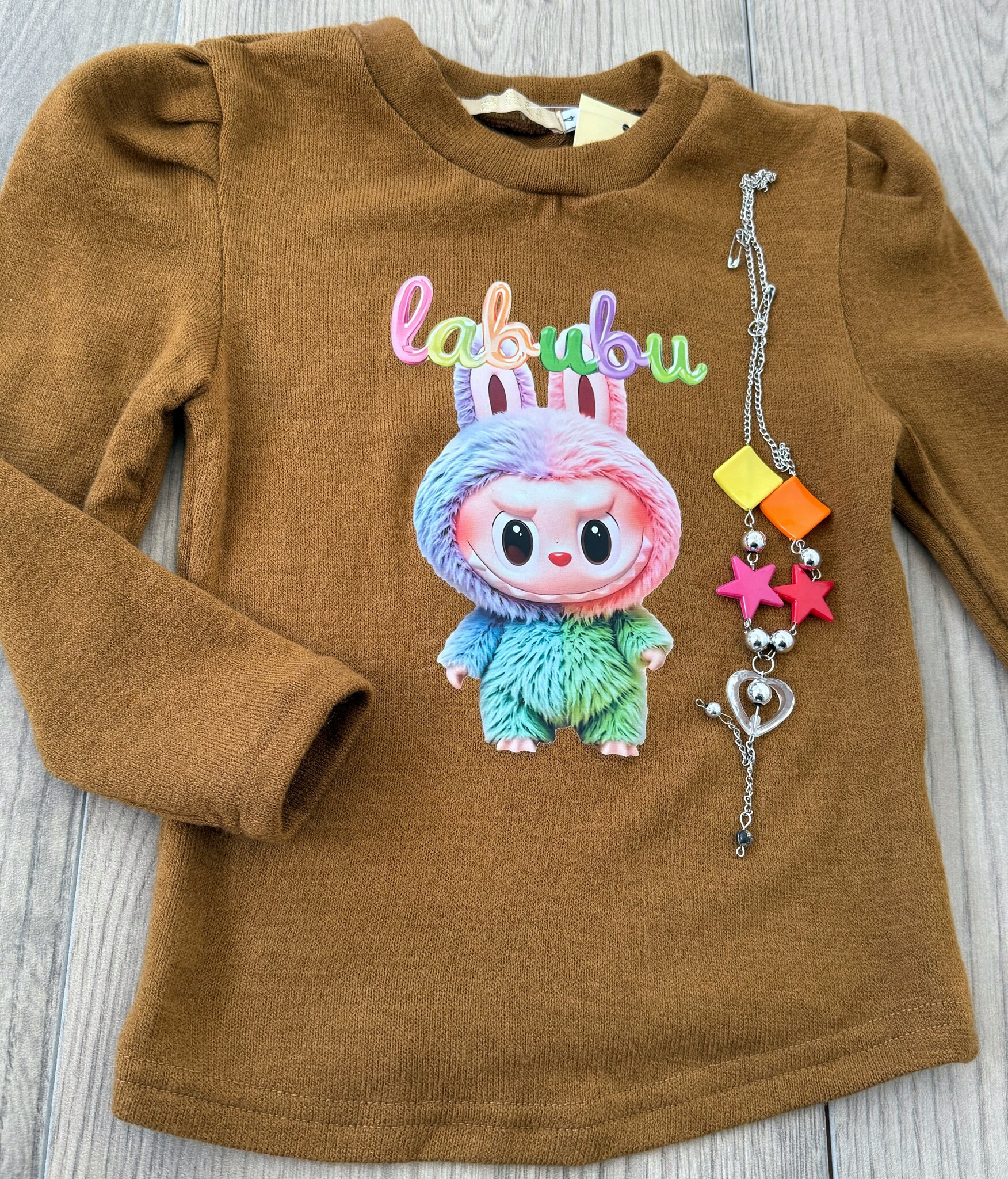 Trendy Labubu meisjes shirt in bruin met kleurrijke print en pofmouw. Inclusief bijpassende ketting. Comfortabel en hip. Maten 98/104 t/m 158/164.