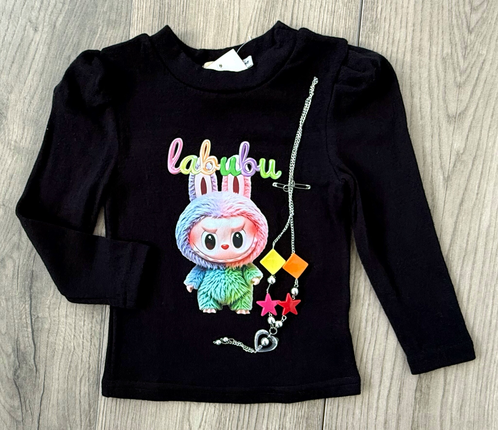 Stoer zwart Labubu meisjes shirt met kleurrijke print en pofmouw. Inclusief vrolijke ketting. Comfortabel, hip en uniek. Maat 98/104 t/m 158/164.