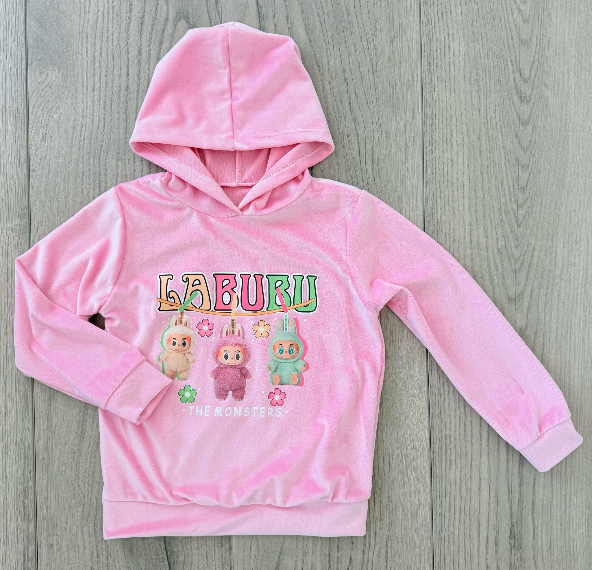 De roze Labubu velours trui is gemaakt voor meisjes die houden van kleur, zachtheid en schattige details. De kleurrijke Labubu figuurtjes op de hoodie geven de outfit een speelse en vrolijke uitstraling!