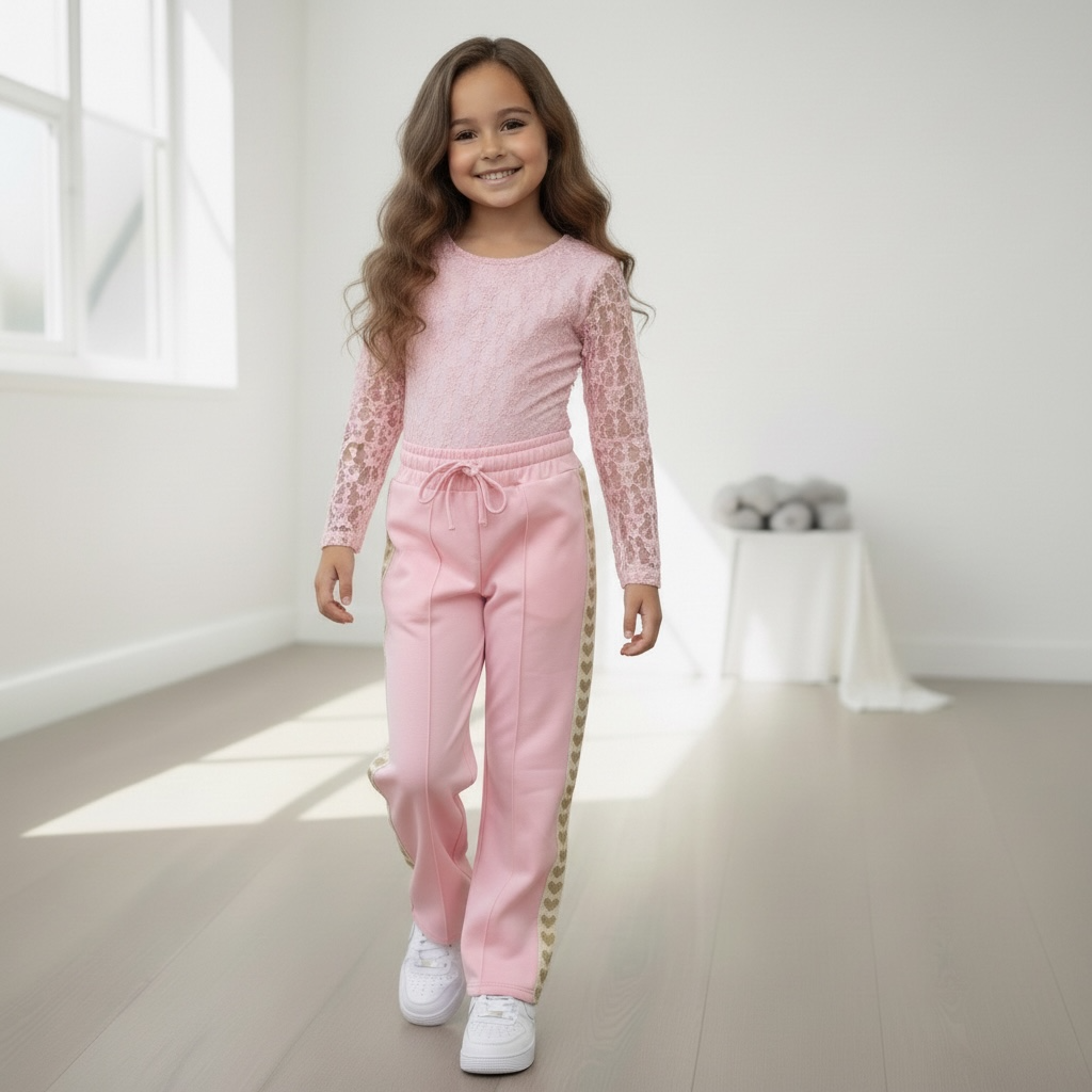 Elegante roze lace bodystocking voor meisjes met kanten details en lange mouwen.