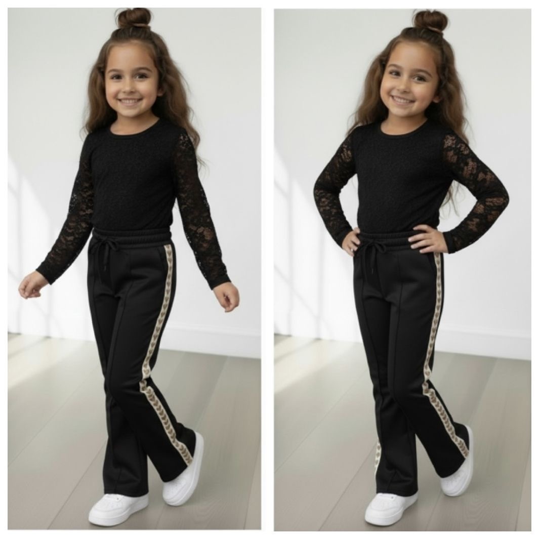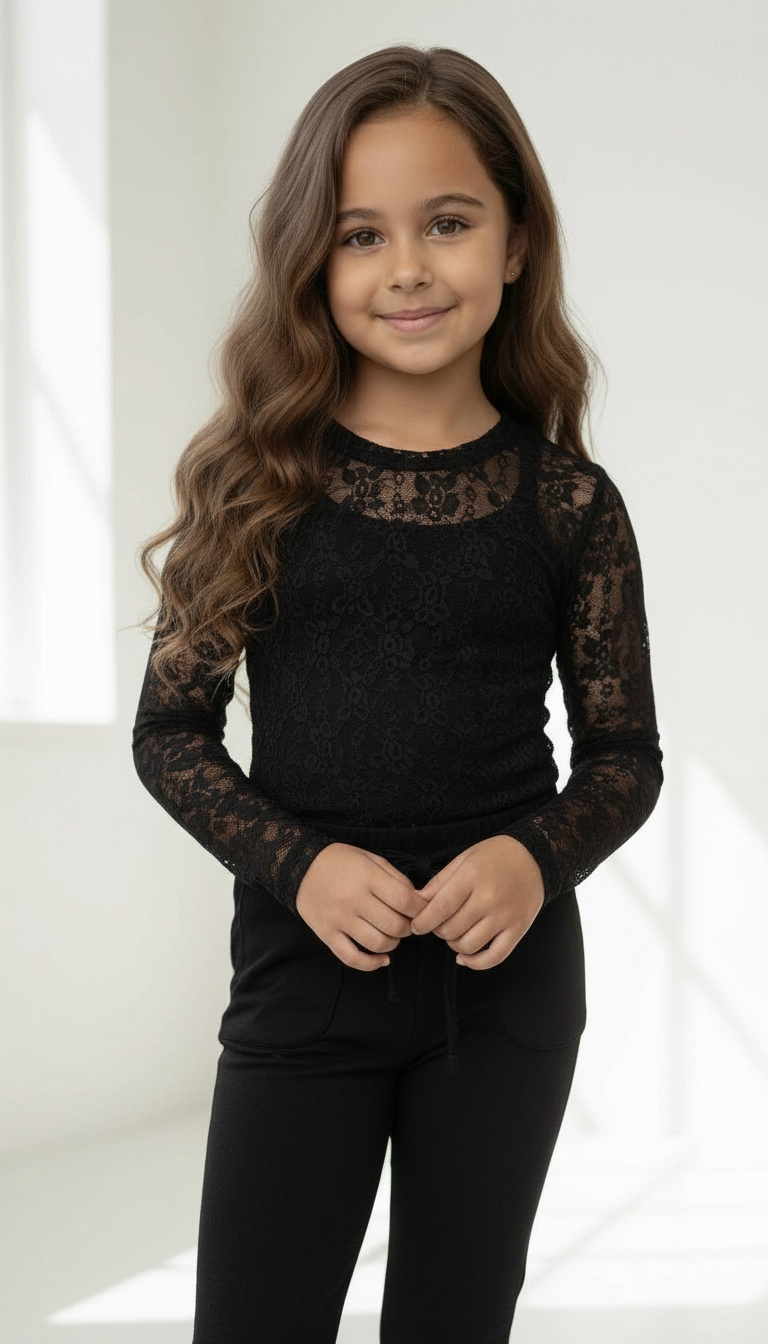 Elegante zwarte lace bodystocking voor meisjes met kanten details en lange mouwen.