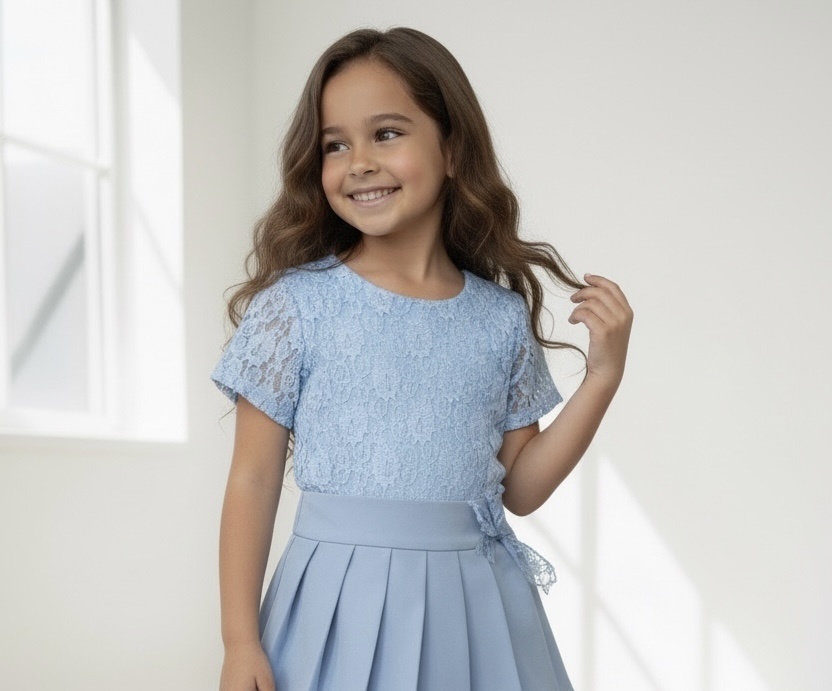 Elegante blauwe lace top voor meisjes met verfijnde kanten details en korte mouwen.