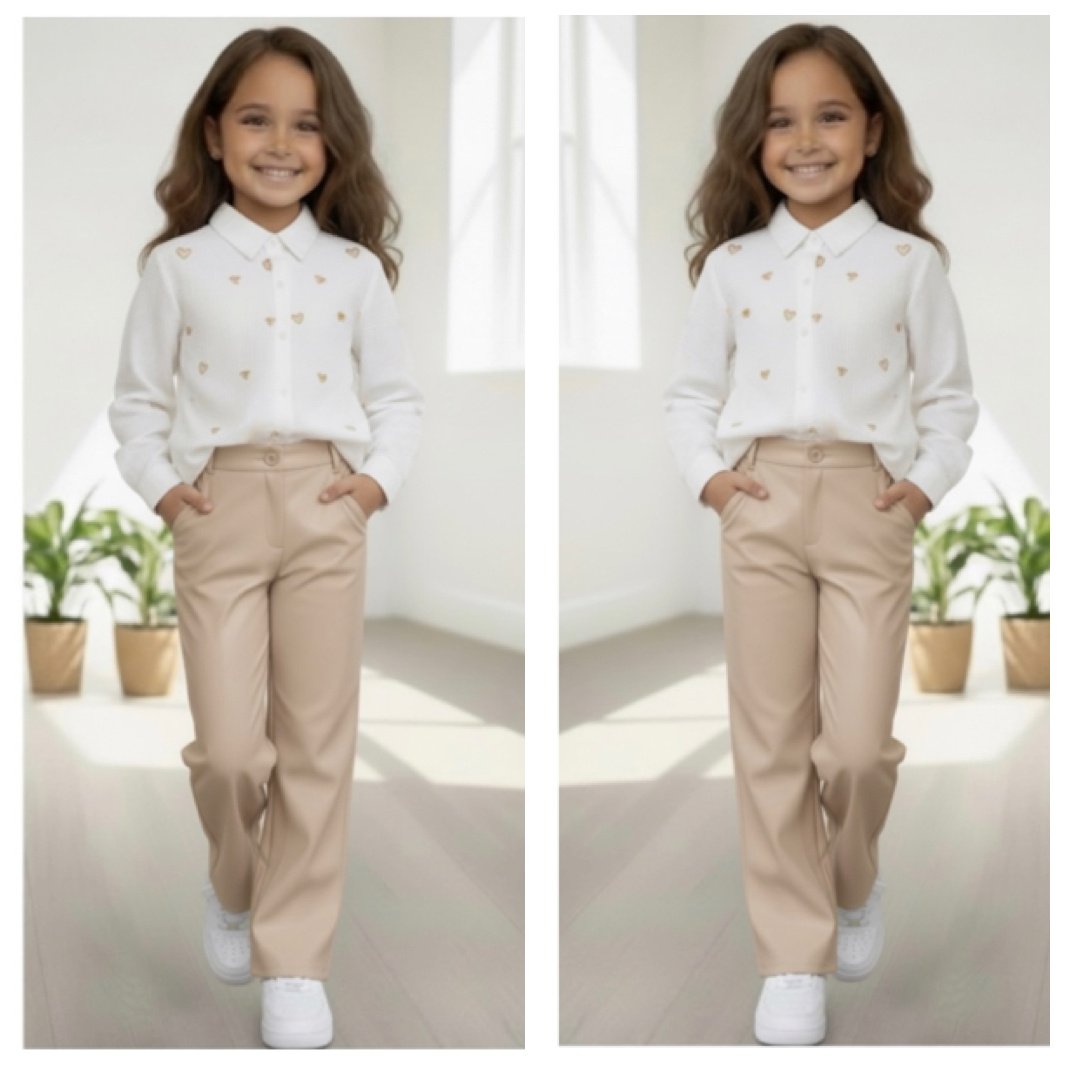 Een super toffe leatherlook broek voor kinderen in de kleur beige