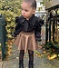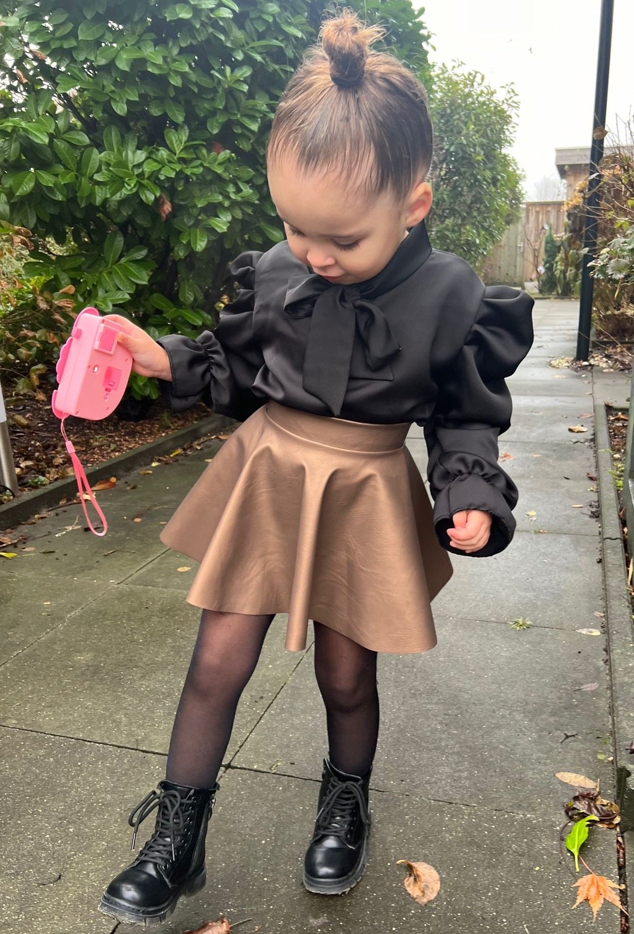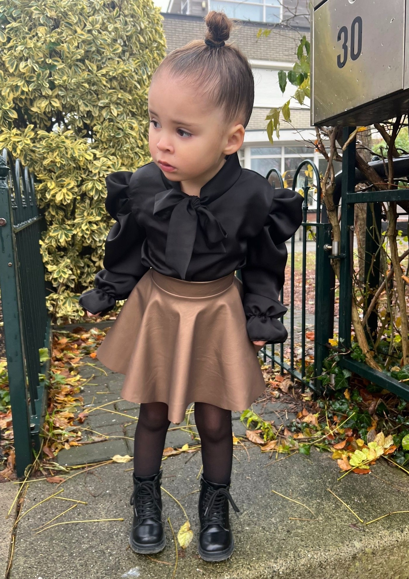 Trendy bronzen leatherlook rokje voor meisjes. Stoer en stijlvol, ideaal voor de feestdagen of casual met een blouse of sweater. Verkrijgbaar in maat 74/80 t/m 134/140.