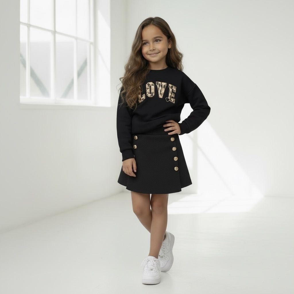 Deze stijlvolle 2-delige meisjes set bestaat uit een trendy skort en een bijpassende sweater. De perfecte combinatie van comfortabel en chic, geschikt voor zowel dagelijkse outfits als speciale momenten.