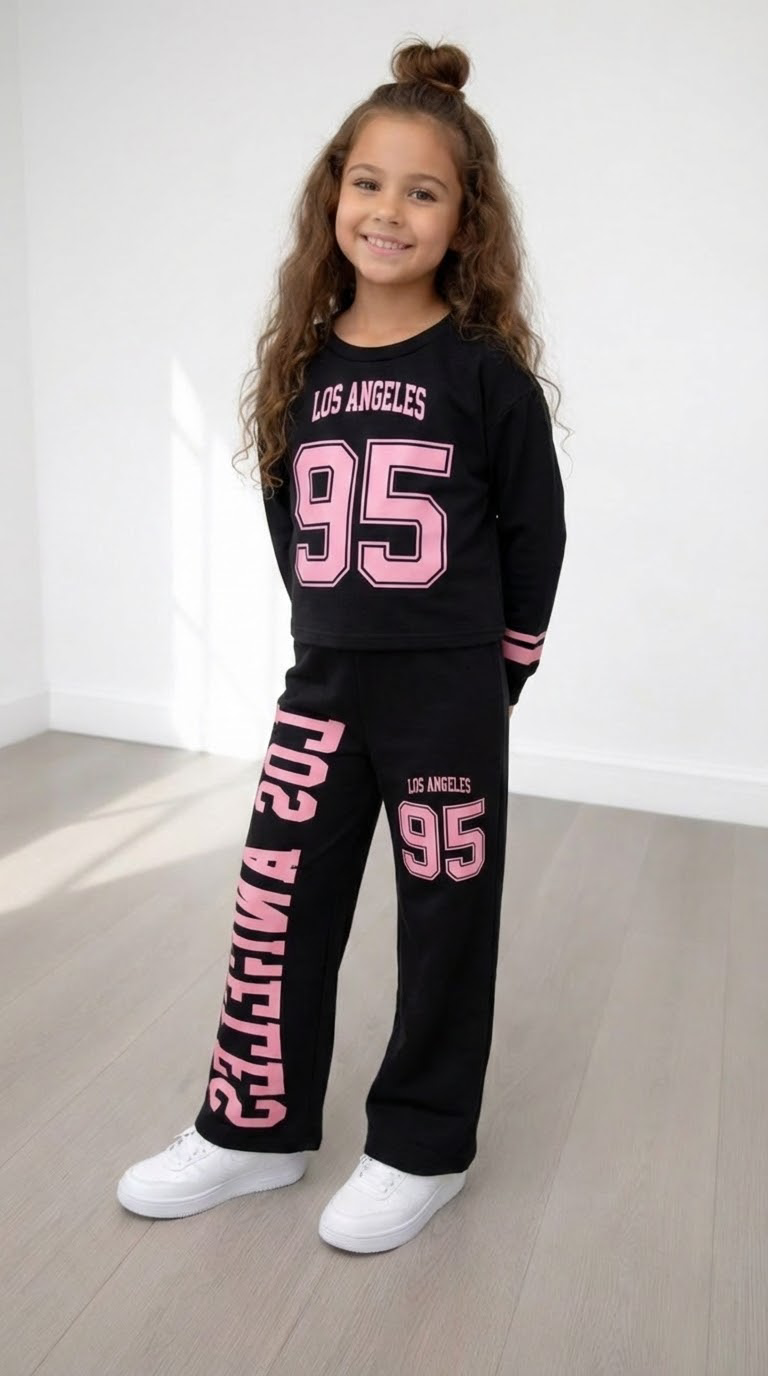 Los Angeles meisjes set bestaande uit een lange mouwen shirt en een flared broek. Comfortabel én trendy! Perfect voor meiden wdie houden van fashion. Verkrijgbaar van maat 98/104 t/m 158/164.