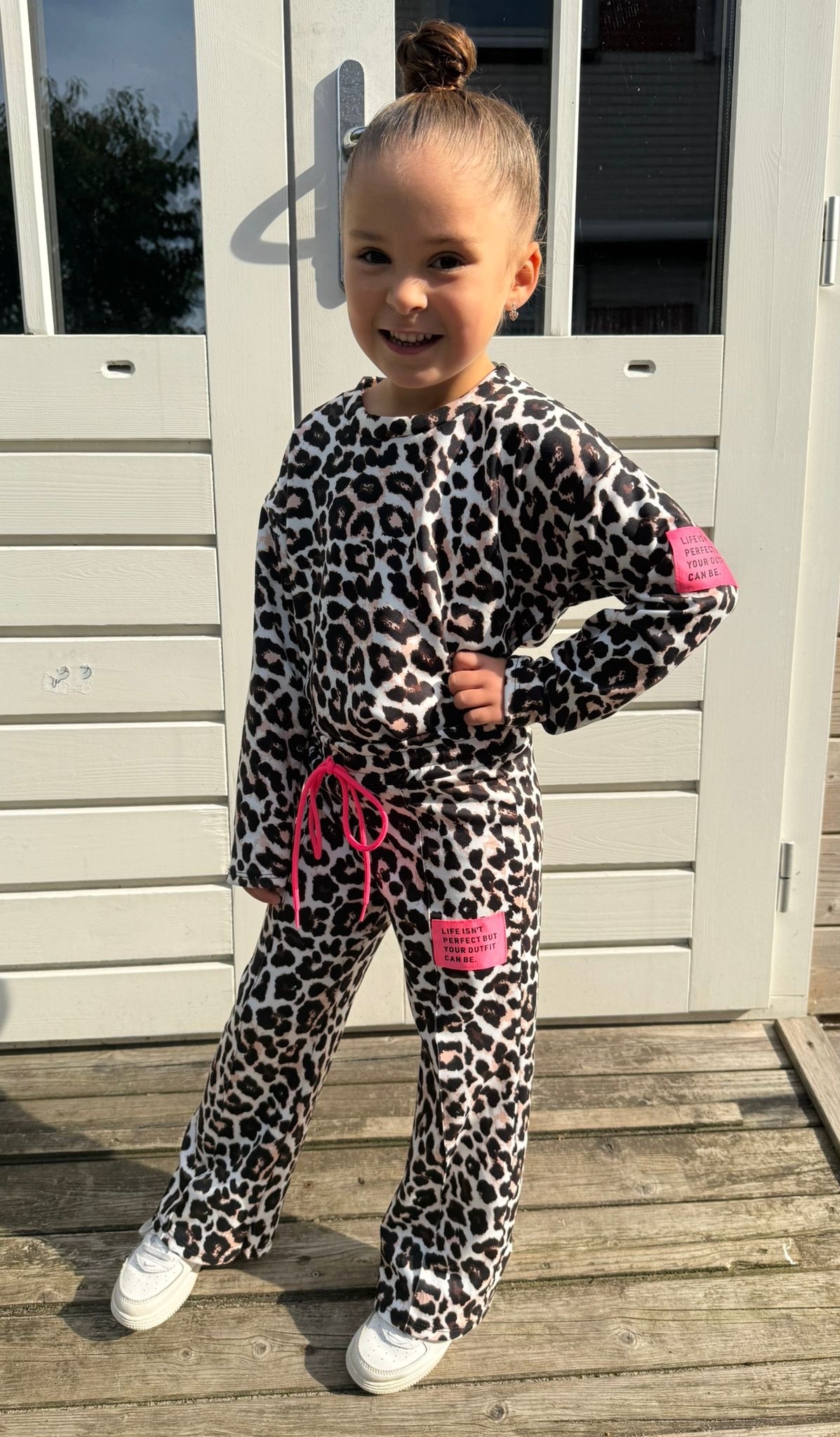 Dit stoere 2-delige luipaard setje is een echte musthave voor meisjes die van hippe outfits houden. Het setje bestaat uit een longsleeve trui en een flared broek met luipaardprint en felroze accenten. Dankzij de elastische taille en zachte stof zit het comfortabel én stijlvol. Perfect voor school, een dagje uit of gewoon lekker thuis. Verkrijgbaar in maat 98/104 t/m 146/152. Combineer dit setje met sneakers of laarsjes en maak de outfit helemaal compleet.