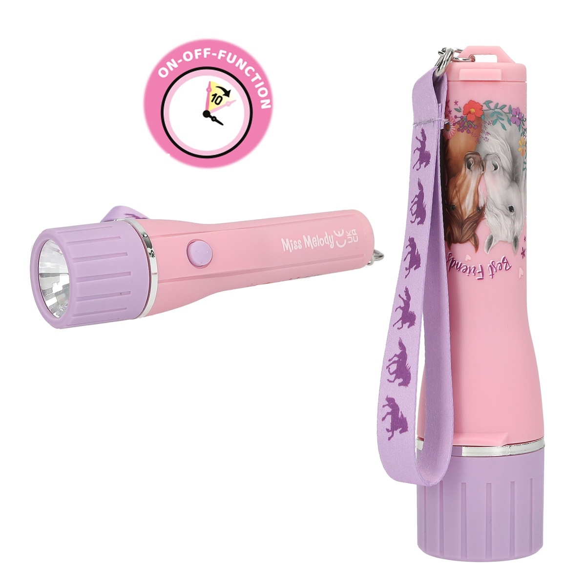 Spot aan voor Miss Melody: de zaklantaarns hebben elegante kleuren. Ze zijn verkrijgbaar in mint-roze en roze-paars met matte finish, metallic details, betoverende paardenafbeeldingen en een bedrukte handlus. De zaklantaarn heeft een handige switch off functie (deze gaat na 10 minuten automatisch uit). 2 AA batterijen ingesloten.
