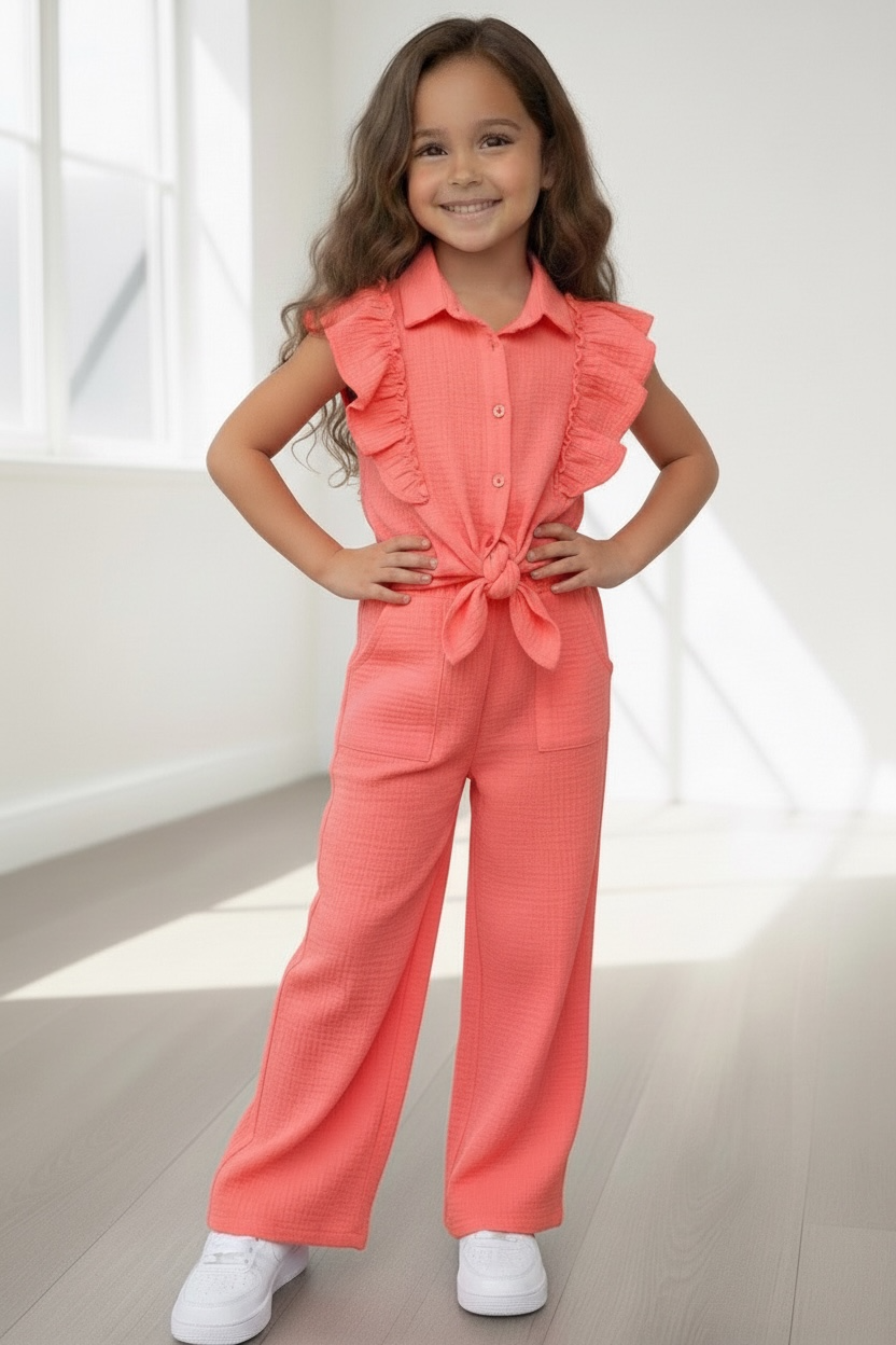 Trendy 2-delige meisjes set met coral kleur broek en coral topje. Comfortabel, stijlvol en perfect voor een casual of zomerse look. Makkelijk te combineren voor elke dag. Verkrijgbaar in maat 98/104 t/m 158/164.