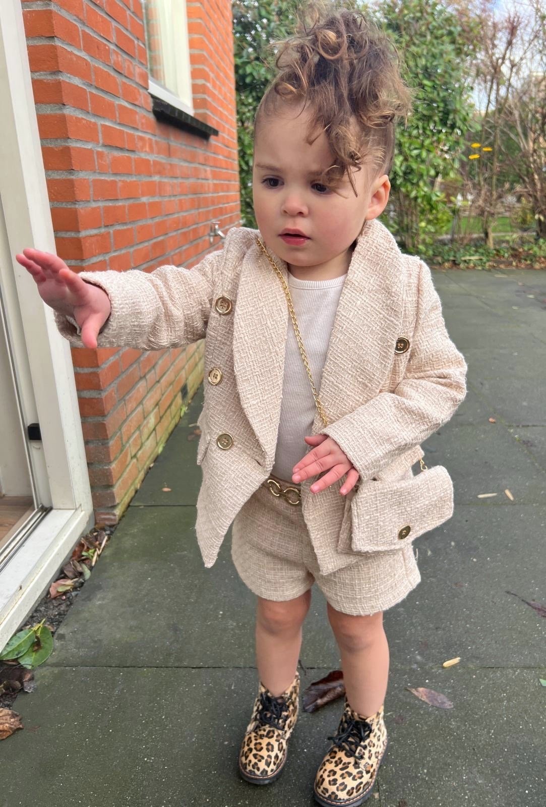 Chic 3-delig meisjes setje in beige: jasje, short en bijpassend tasje. Ideaal voor feestjes, verjaardagen of speciale gelegenheden. Verkrijgbaar in maat 86/92 t/m 146/152.