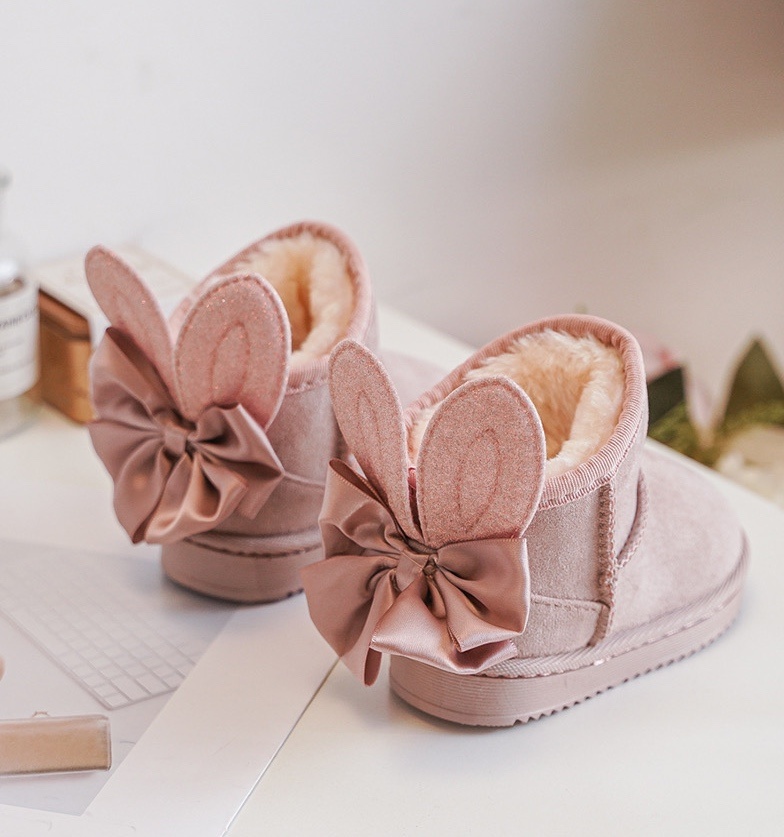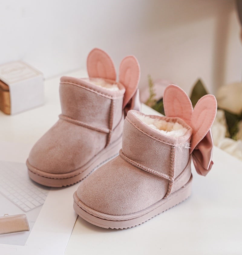 Schattige meisjes uggies met konijnen-oortjes, glitterdetails en satijnen strik. Warme voering en stevige zool. Verkrijgbaar in maat 19 t/m 30.