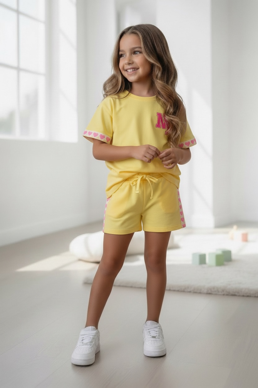 Vrolijk geel setje voor meisjes met bijpassende short. Zachte stof en speelse hartjes details maken dit een echte musthave voor de zomer.