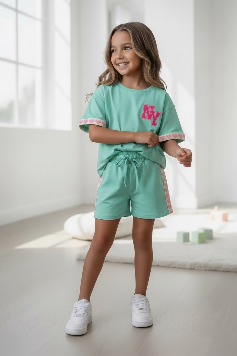 Stijlvol groen meisjes setje met T-shirt en short. Voorzien van NY logo en schattige hartjes details aan de zijkant. Comfortabel en perfect voor warme dagen.