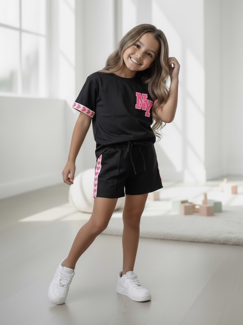 2-delig setje: T-shirt met NY logo + short met strikkoord en hartjes details langs de zijkant.