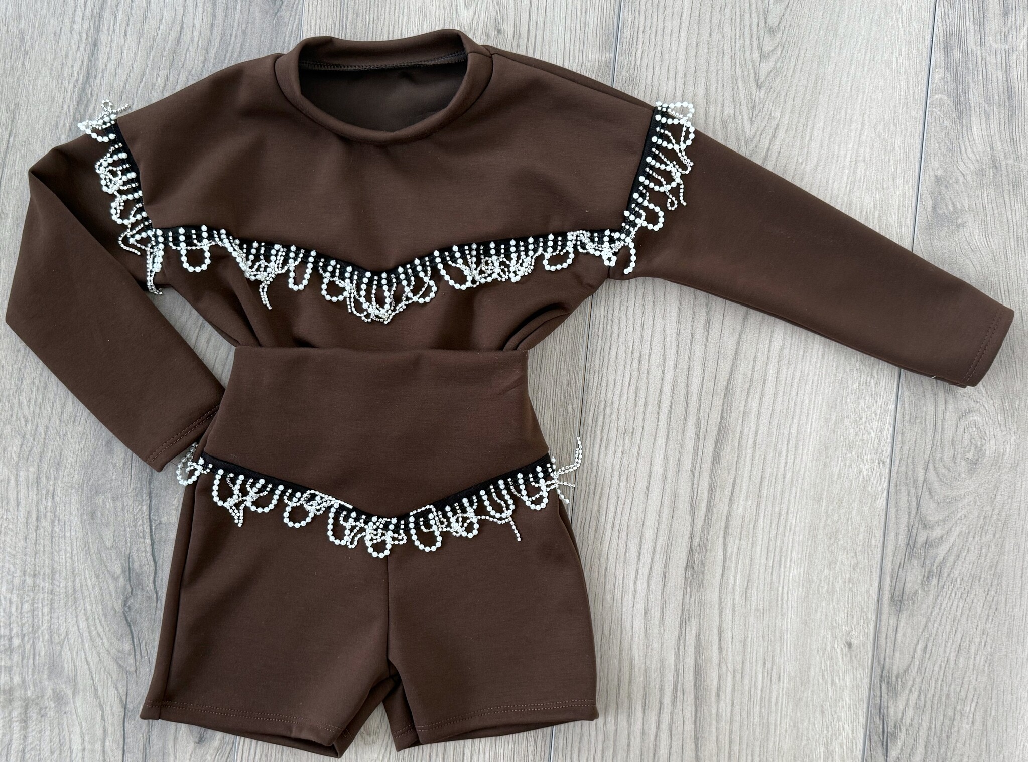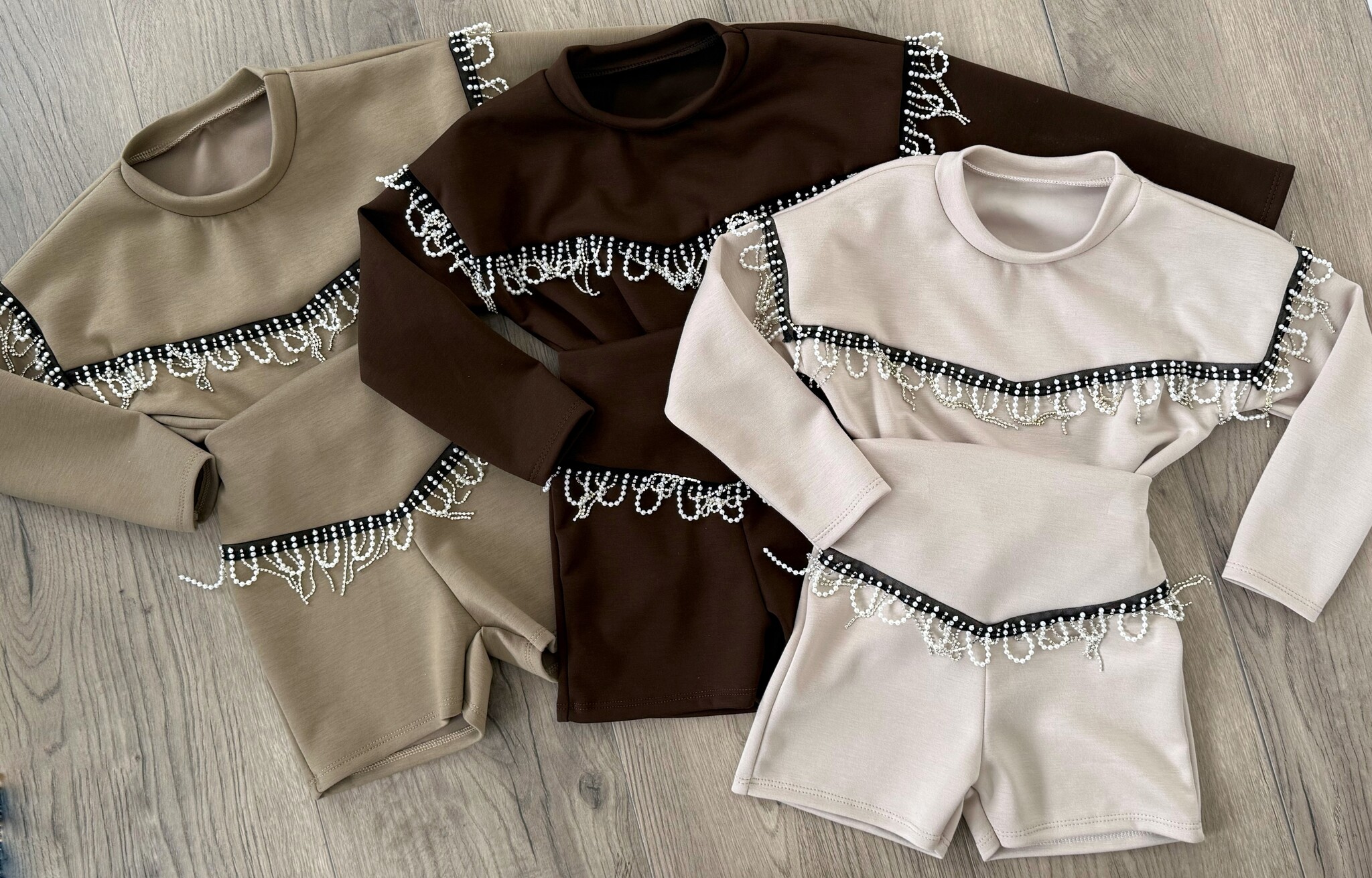 Dit stijlvolle setje bestaat uit een top met lange mouwen en een bijpassend shortje. Beide delen zijn afgewerkt met prachtige parel franjes voor een luxe en speelse look.