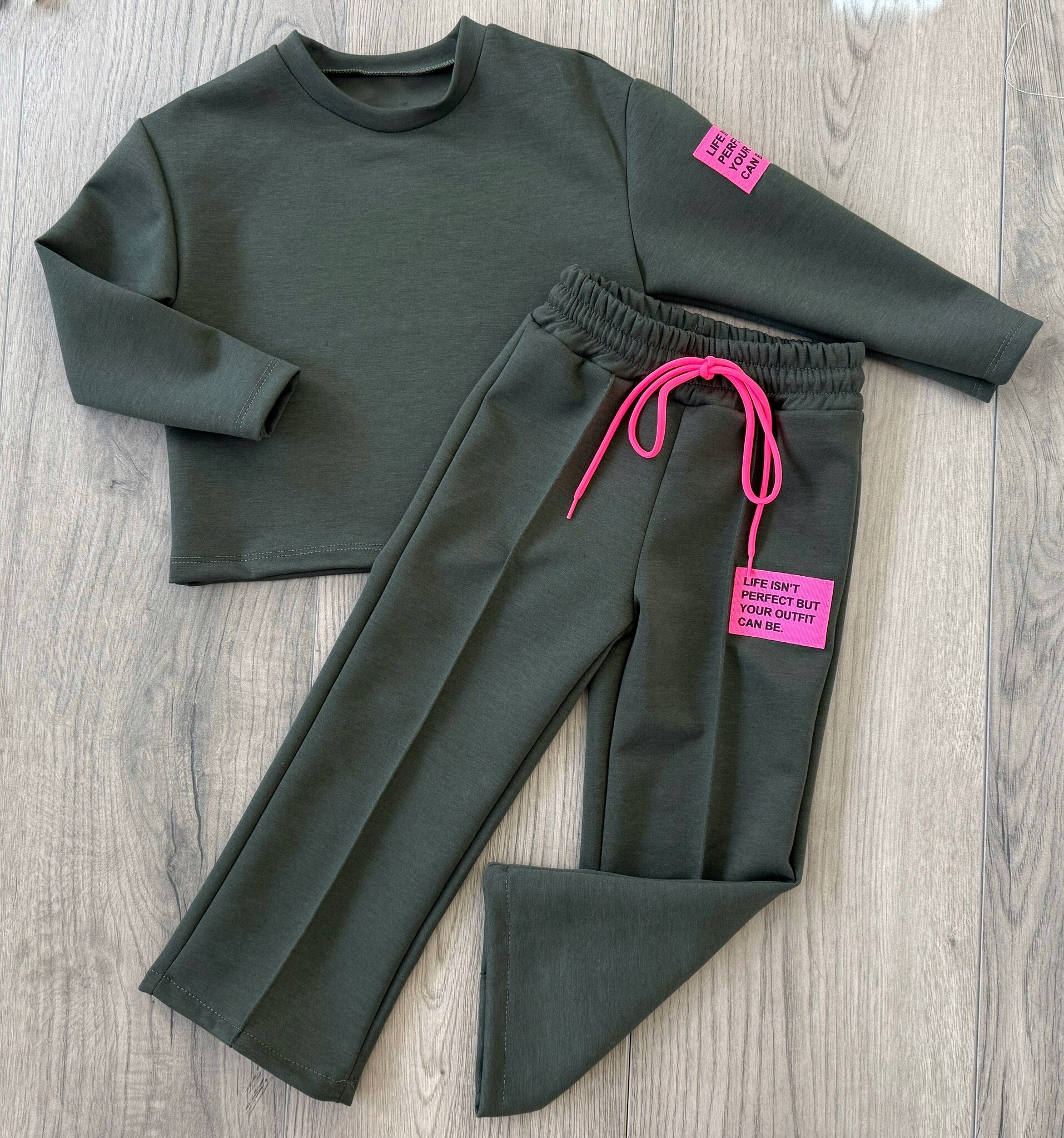 Groen meisjes set bestaande uit een lange mouwen shirt en een flared broek met tekstlabel op het been. Comfortabel én trendy! Perfect voor meiden wdie houden van fashion. Verkrijgbaar van maat 98/104 t/m 158/164.