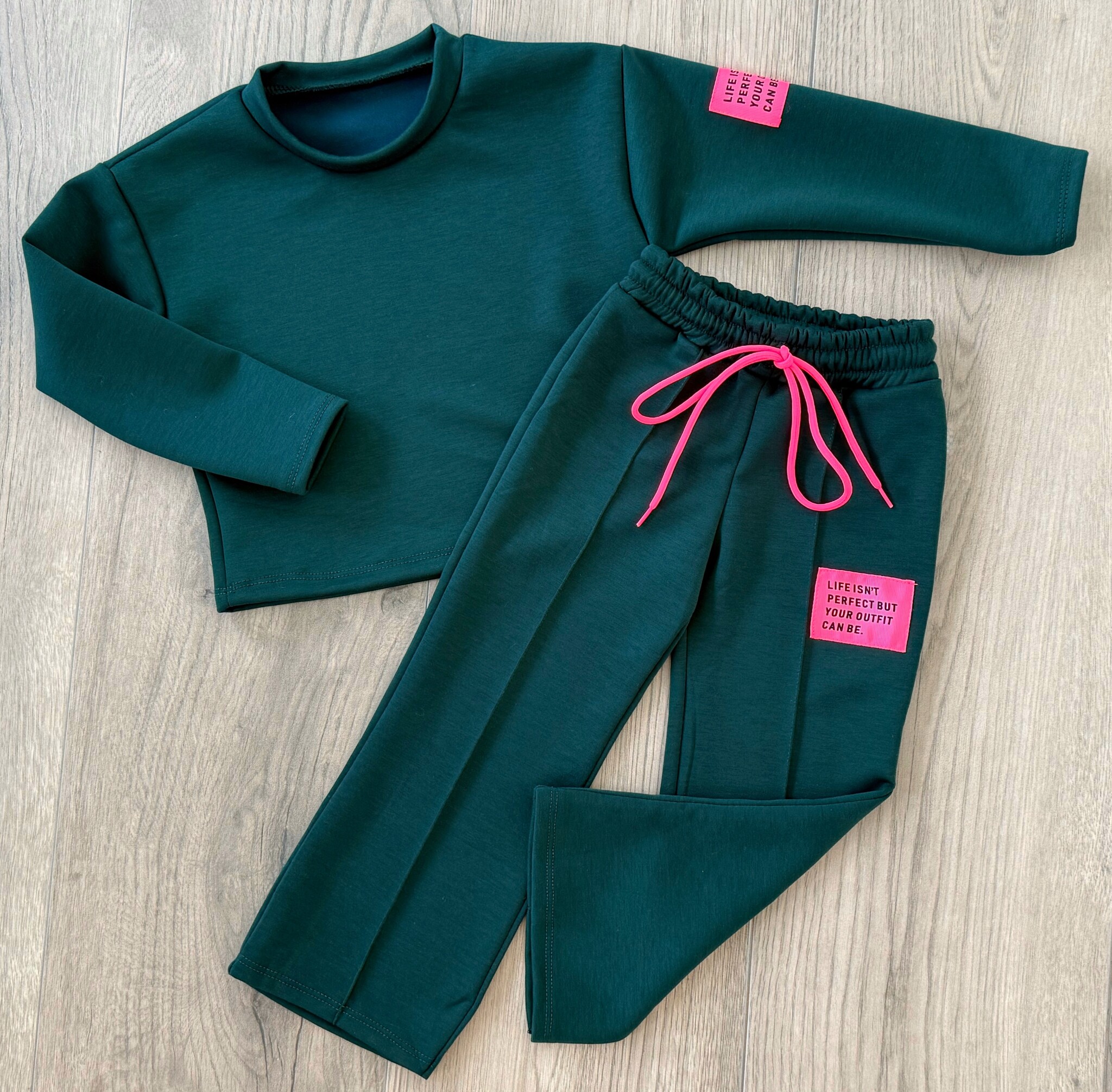 Groen meisjes set bestaande uit een lange mouwen shirt en een flared broek met tekstlabel op het been. Comfortabel én trendy! Perfect voor meiden wdie houden van fashion. Verkrijgbaar van maat 98/104 t/m 158/164.