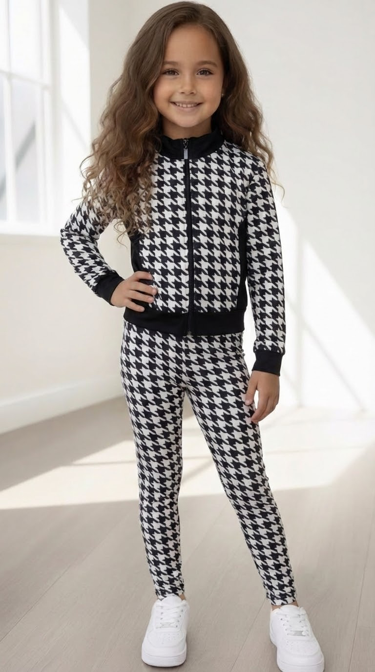 Dit stijlvolle zwart-witte pied-de-poule joggingpak voor meisjes is dé perfecte combinatie van comfort en fashion. De set bestaat uit een vest met rits en een bijpassende legging, uitgevoerd in een klassieke pied-de-poule print met zwarte details.