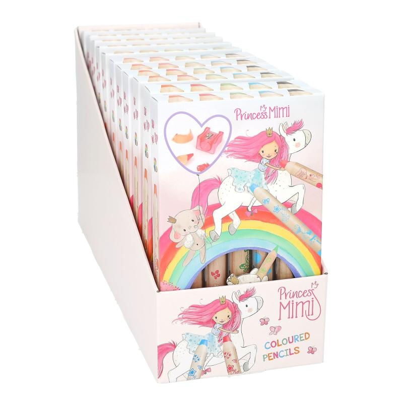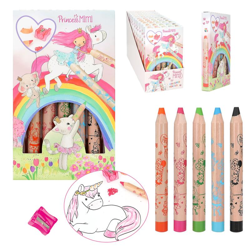 De 5 dikke kleurpotloden van Princess Mimi in oranje, roze, groen, blauw en zwart zijn ideaal voor kleine, creatieve handjes. Met schattige all-over print in de kleur van het potlood zelf. Tevens ingesloten: een roze puntenslijper.