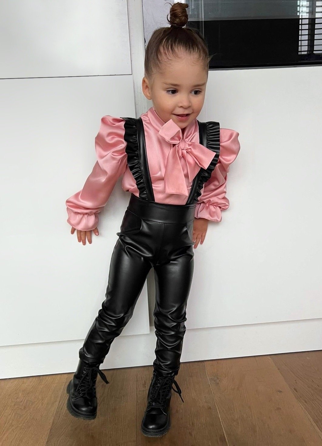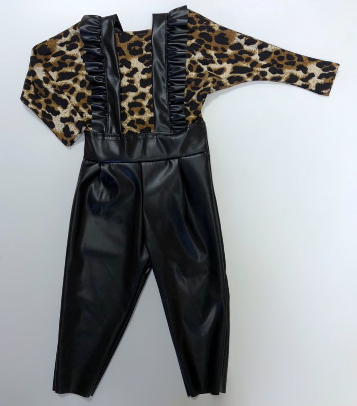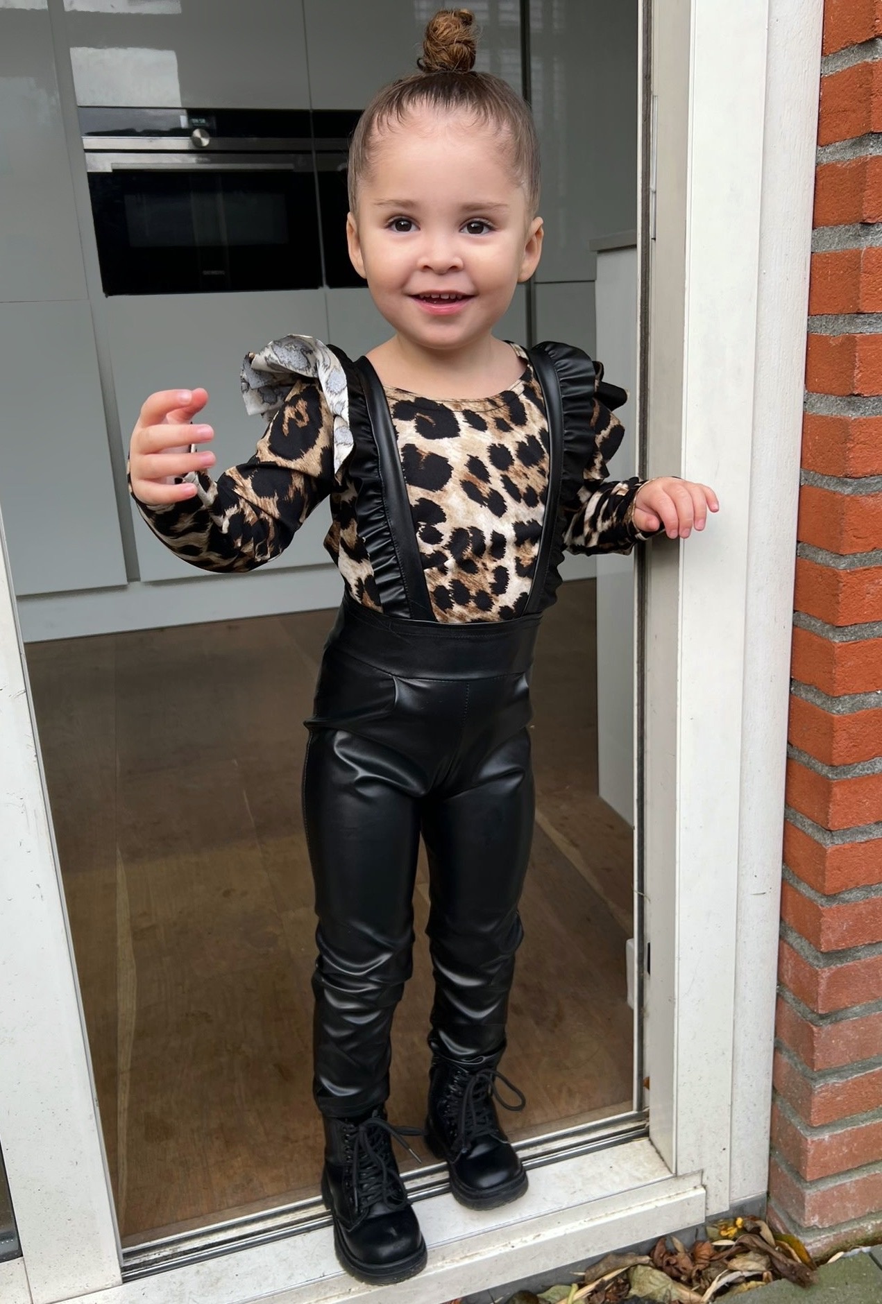 De ruffle suspender pants leatherlook is een echte eyecatcher! Door de banden aan deze broek blijft hij goed zitten, en kunnen de kinderen er heerlijk in bewegen.