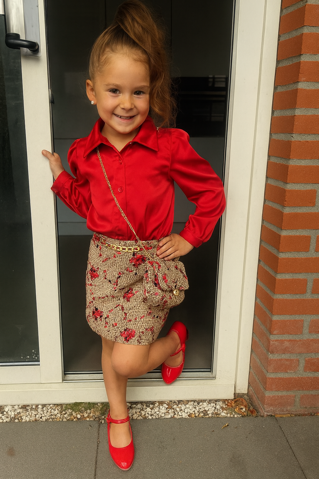 Dit super leuke 3-delige setje bestaat uit een rokje, jasje en een bijpassend tasje