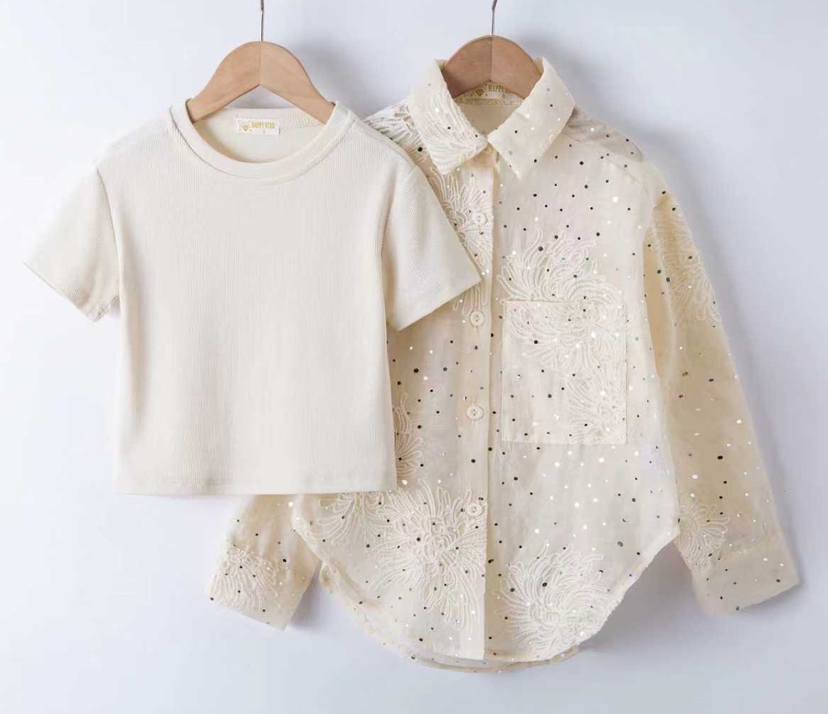 Trendy 2-delige meisjes set met blouse en beige top. Comfortabel, stijlvol en makkelijk te combineren voor elke dag. Perfect voor school of een casual outfit. Verkrijgbaar in maat 98/104 t/m 158/164.