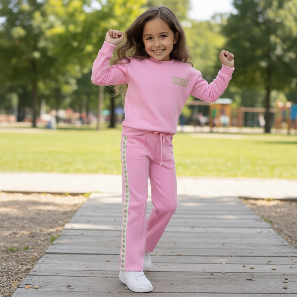 Roze meisjes set bestaande uit een trui en een flared jogger. Comfortabel én trendy! Perfect voor meiden die houden van fashion. Verkrijgbaar van maat 98/104 t/m 158/164.