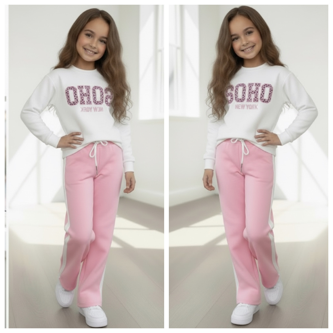 Roze meisjes set bestaande uit een trui en een flared jogger. Comfortabel én trendy! Perfect voor meiden die houden van fashion. Verkrijgbaar van maat 98/104 t/m 158/164.