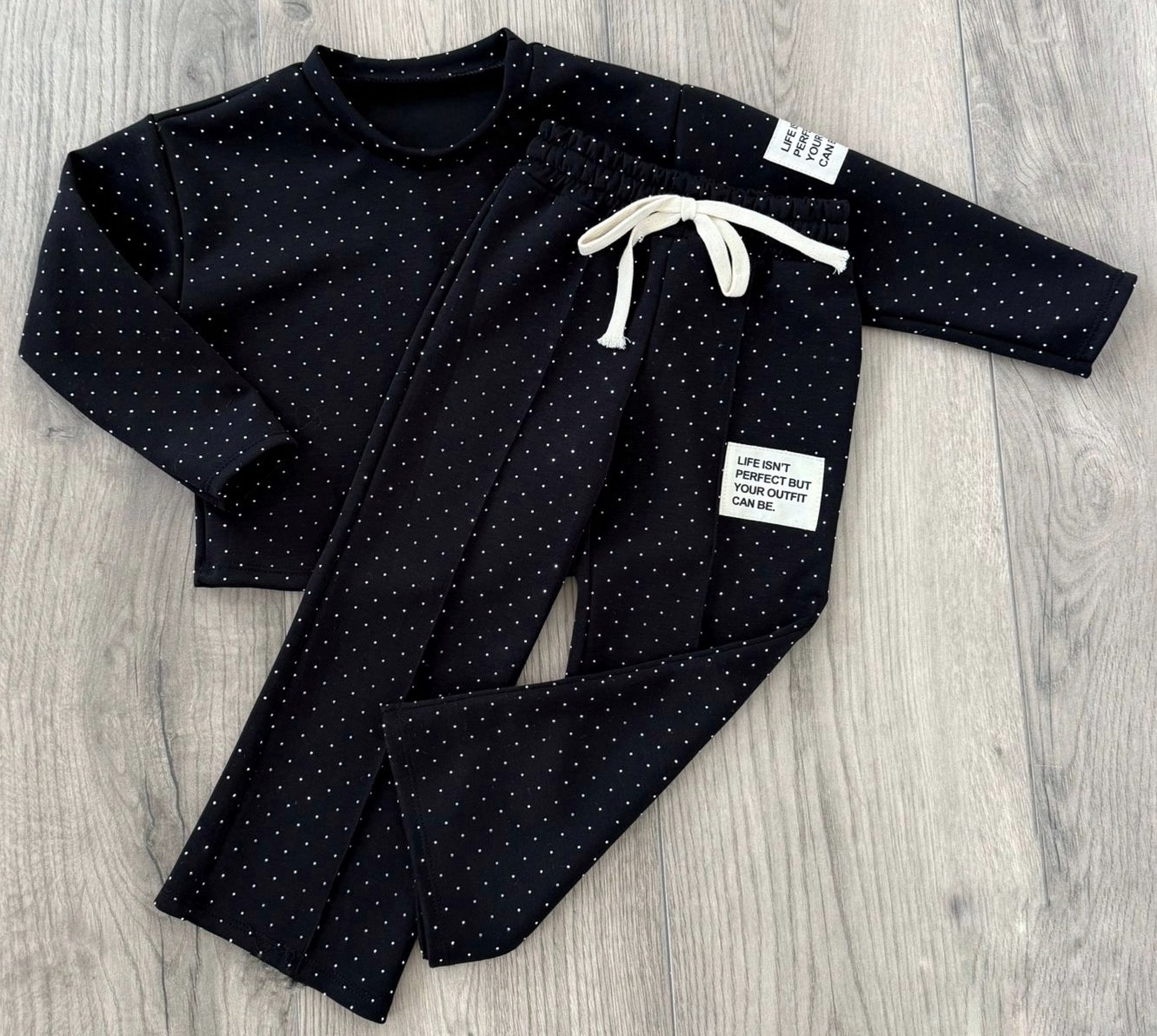 Dit tweedelige meisjes setje is een echte eyecatcher! Zowel het lange mouwen shirt als de flared broek hebben een stoere roze label met de tekst: "Life isn’t perfect but your outfit can be." Het setje is gemaakt van een zachte, comfortabele stretchstof – ideaal om in te spelen én te shinen.