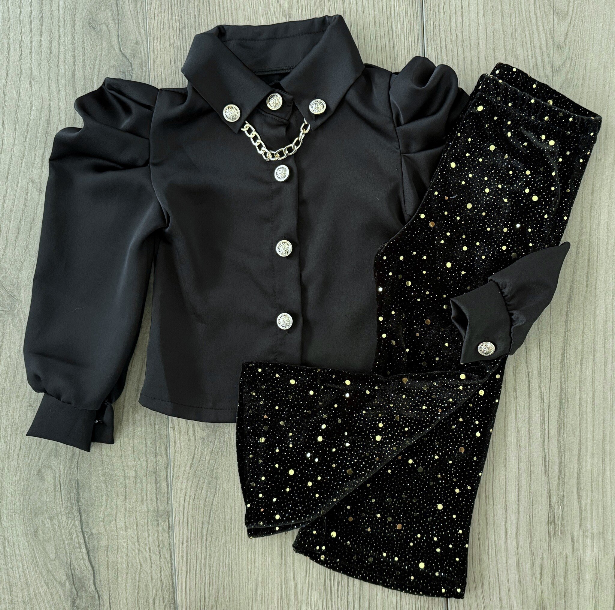 Trendy zwarte glitter flared broek voor meisjes. Comfortabel met stretch en sparkle effect. Perfect voor kerst, feestdagen en party’s. Maat 80/86 t/m 134/140.