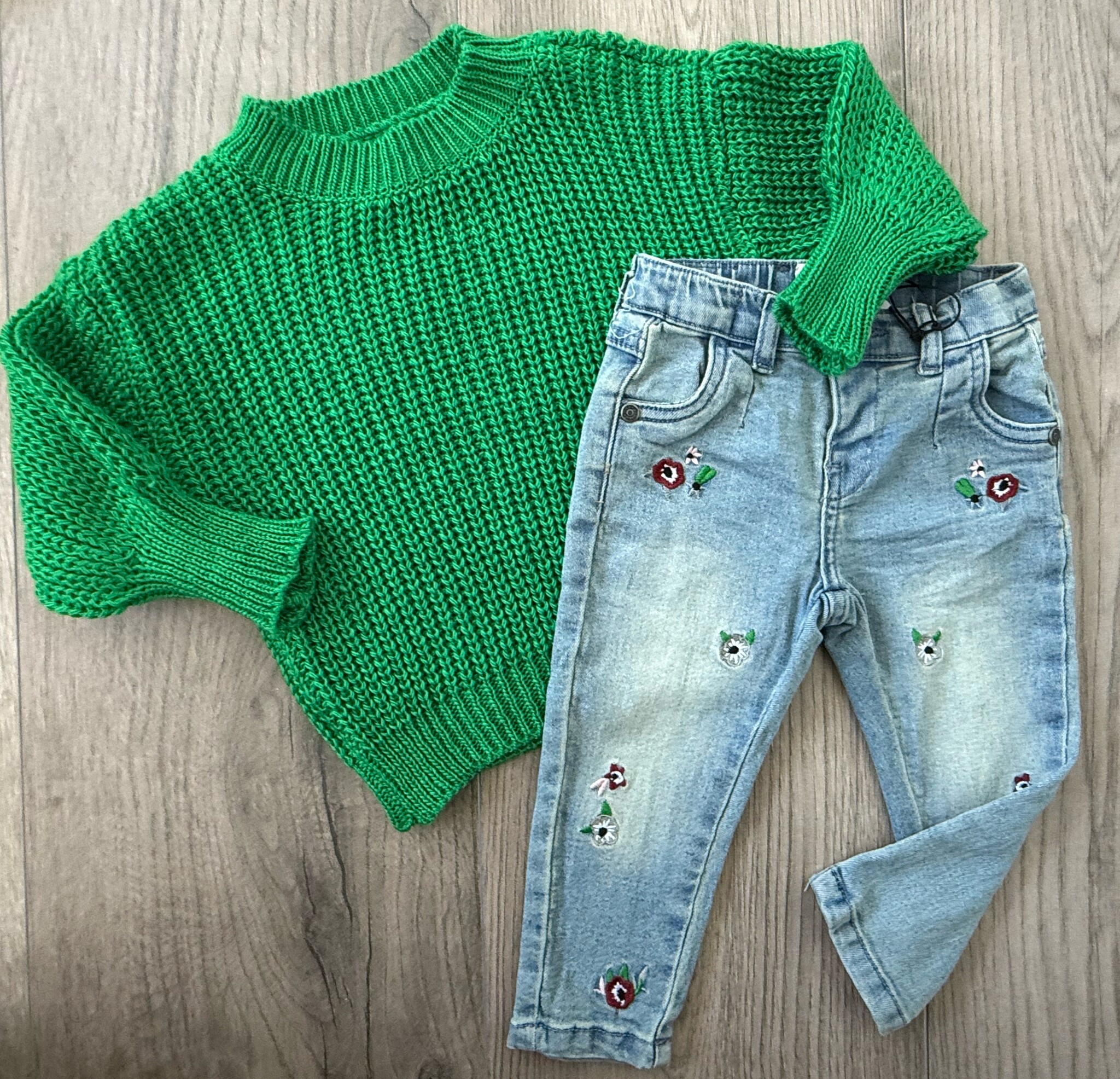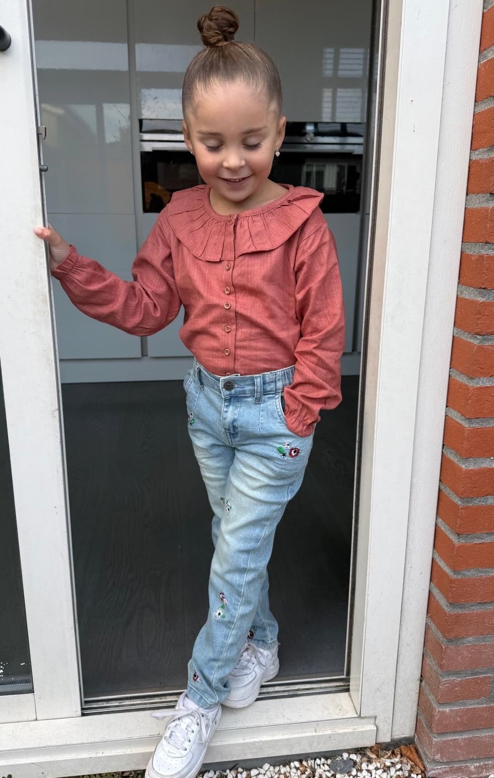 Lichtblauwe jeans van Dirkje met geborduurde bloemen en verstelbare taille. Stoer én lief in één! Verkrijgbaar in maat 80 t/m 116.