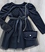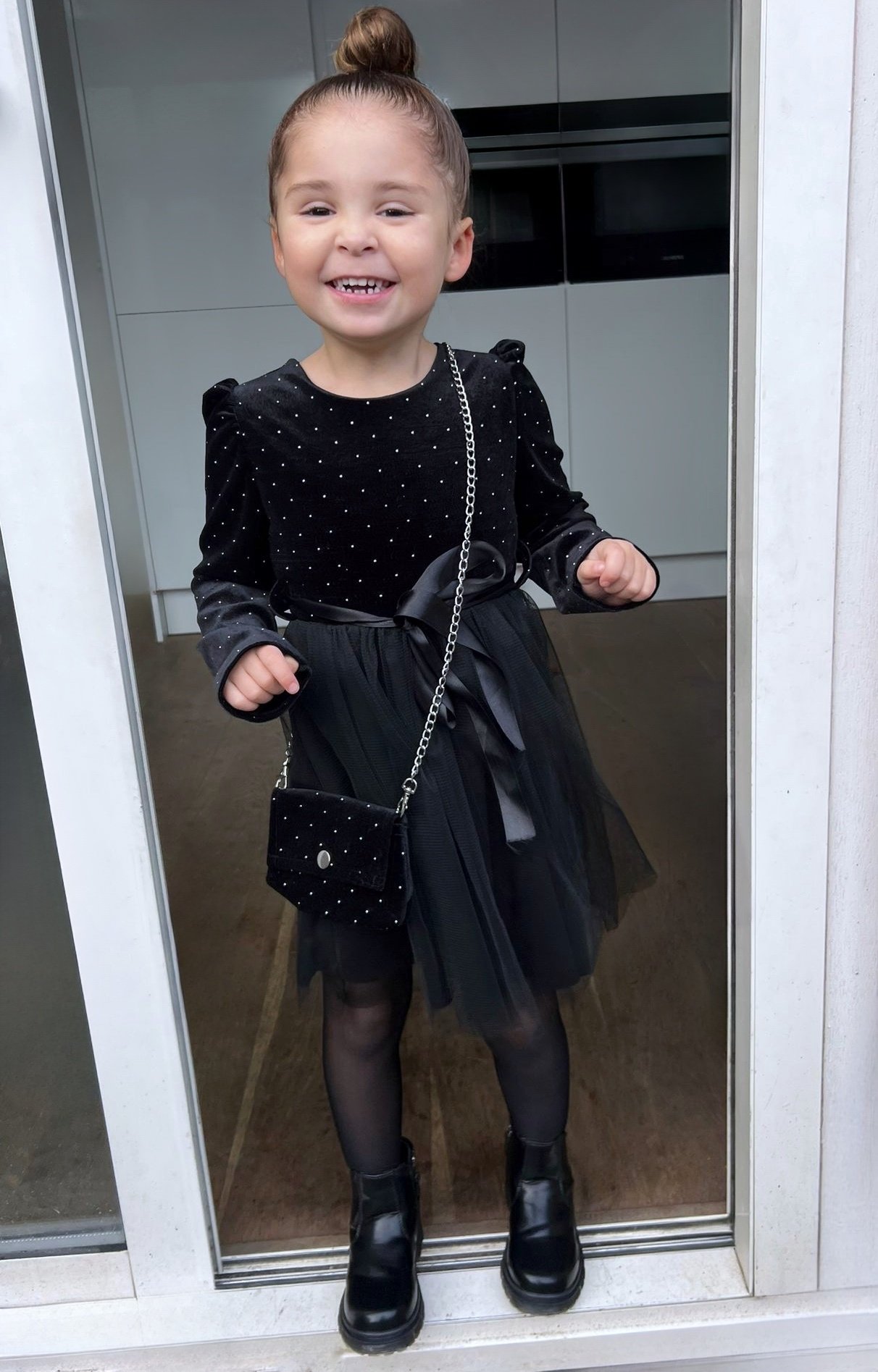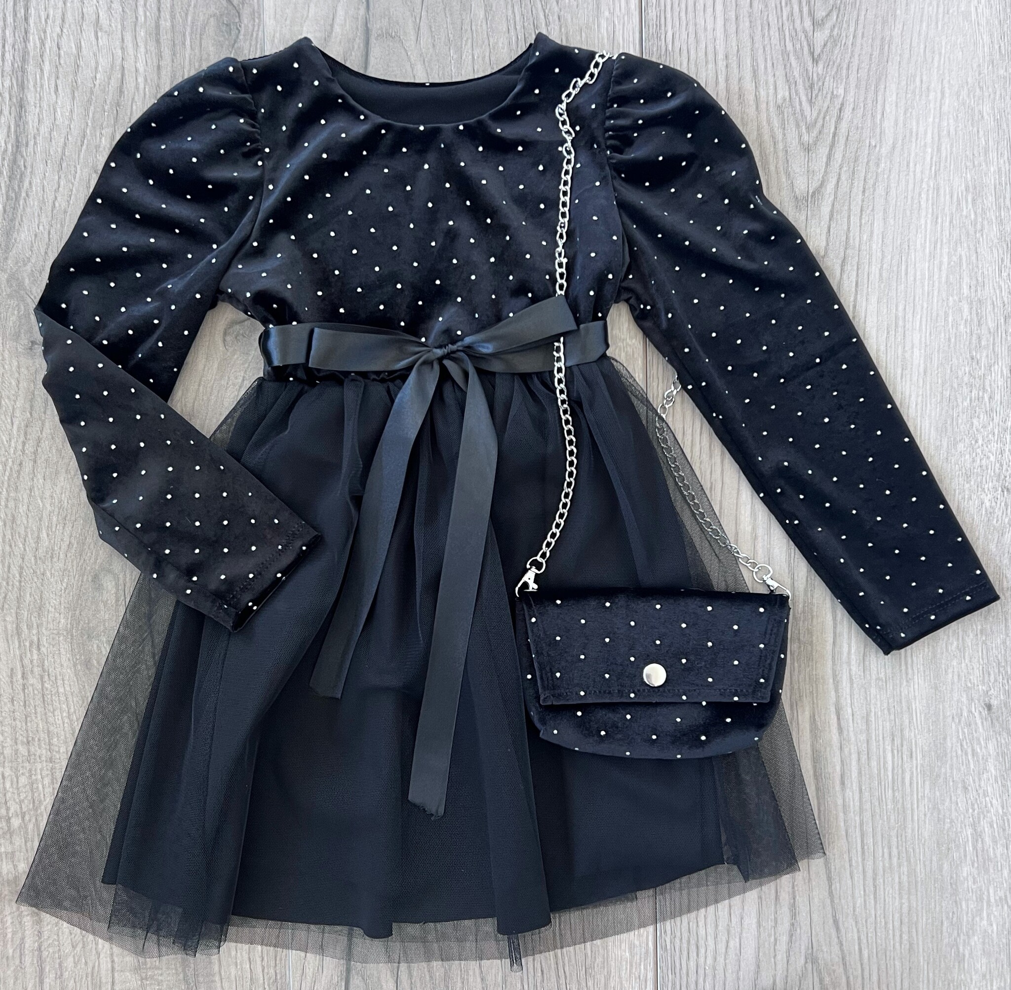 Elegant zwart velvet jurkje met glitters en bijpassend tasje. Ideaal voor kerst, feestjes en speciale gelegenheden. Verkrijgbaar in maat 86/92 t/m 146/152.