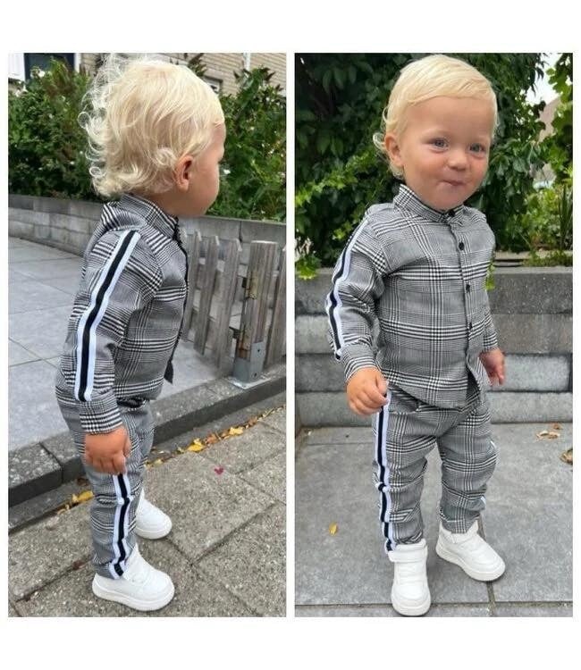 Dit geruite jongens setje combineert een stijlvolle look met een sportieve touch. Het setje bestaat uit een geruit overhemd en een bijpassende jogger, beide voorzien van een opvallende streep langs de mouwen en pijpen.
