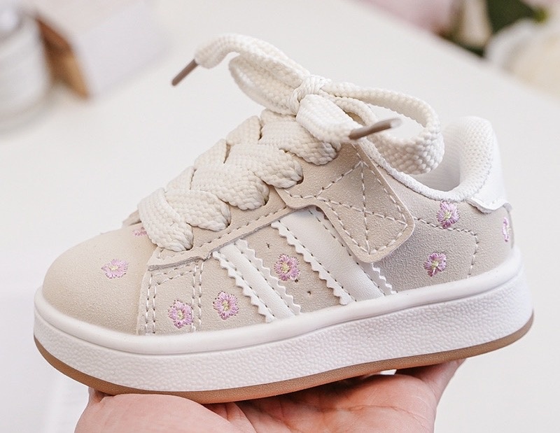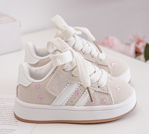 Deze beige baby- en kindersneakers met geborduurde bloemetjes zijn een unieke twist op het klassieke look-a-like adidas model. De schattige roze bloemetjes maken deze sneakers extra speels en perfect voor meisjes die houden van details.