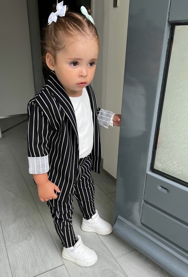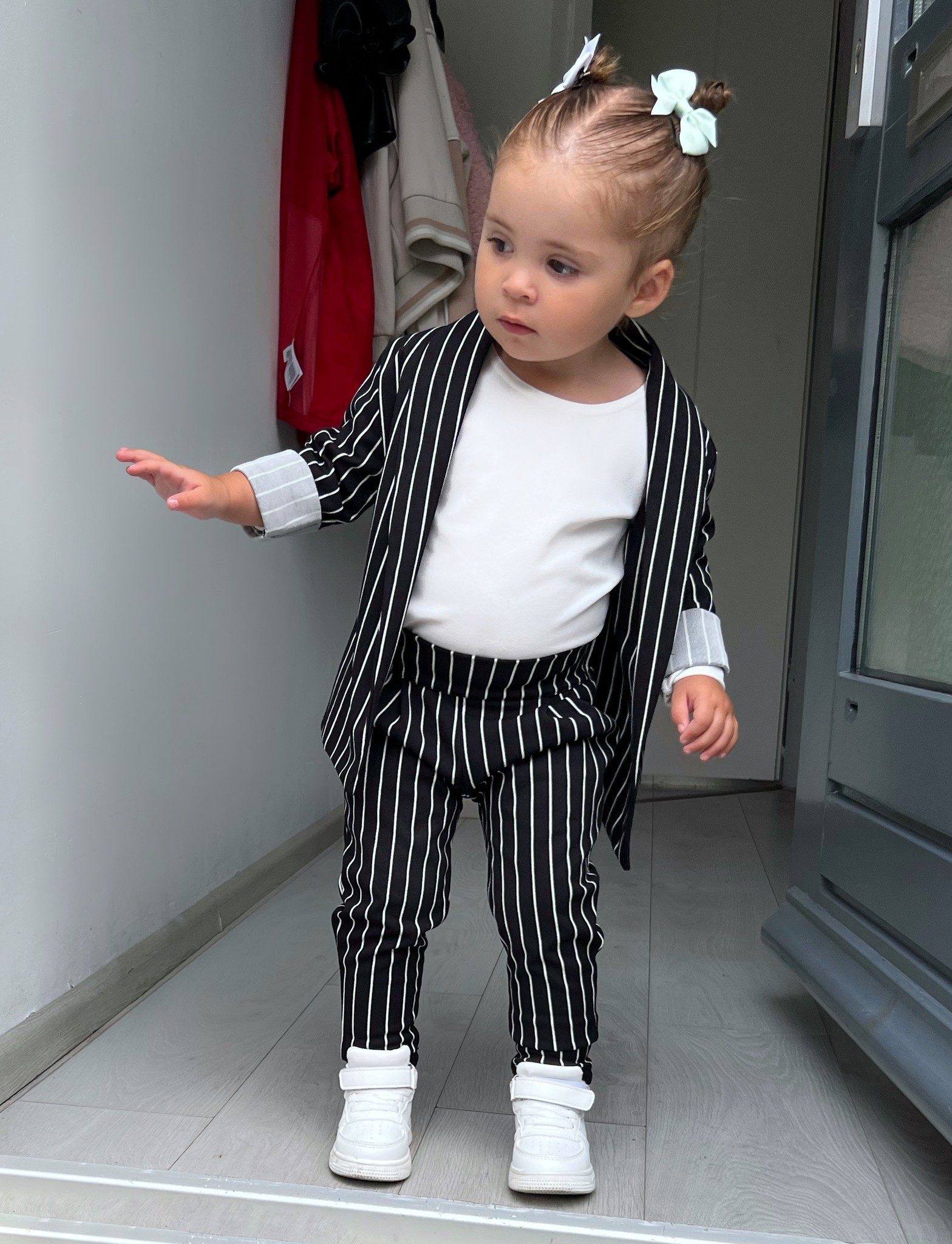 Dit zwarte/wit gestreepte 2-delige setje bestaat uit een nette blazer en een comfortabele broek – perfect voor jouw mini fashionista! Het strakke, tijdloze design maakt dit setje ideaal voor feestjes, fotoshoots of een chique look voor alledag. Combineer het met een opvallend shirtje of topje en stoere boots voor een complete outfit met karakter.