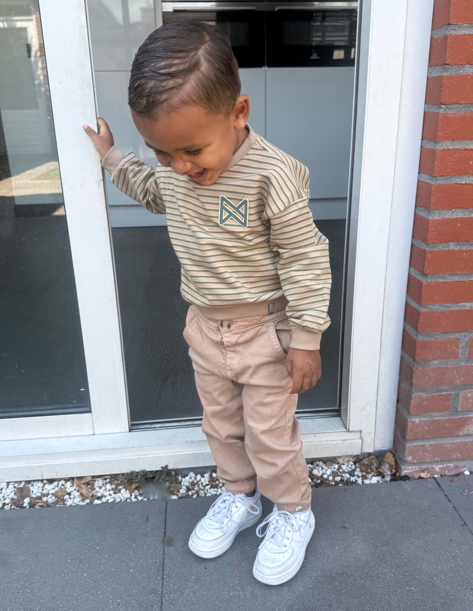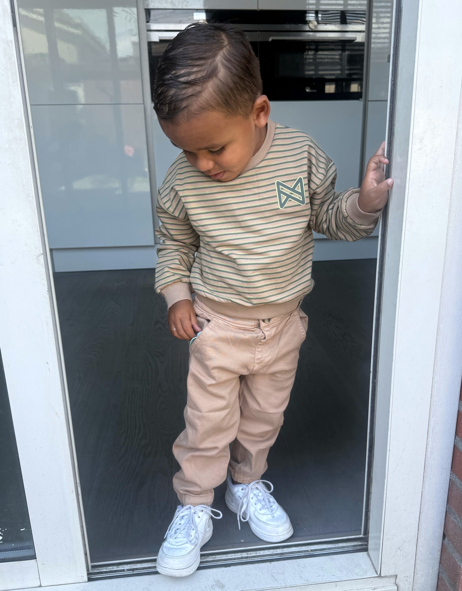 Stoere Koko Noko jongens trui met beige en groene strepen en logo op de borst. Comfortabele pasvorm, ideaal voor elke dag. Maat 80 t/m 128.