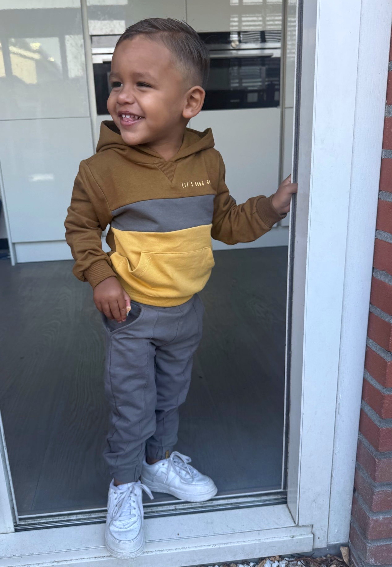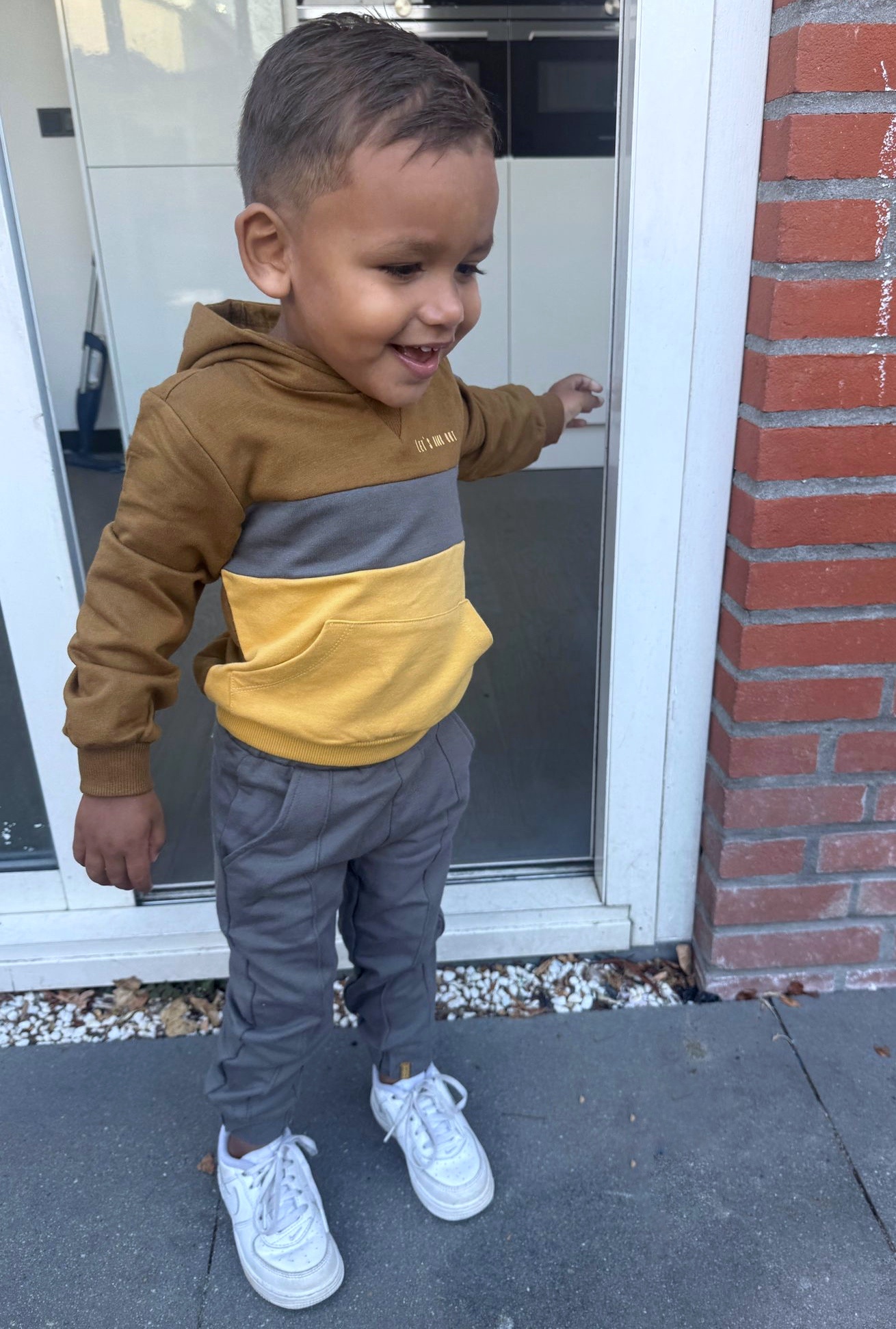 Stoere colorblock hoodie van Koko Noko in bruin, grijs en geel. Gemaakt van zachte katoenmix, met kangoeroezak en capuchon. Maat 80 t/m 128.