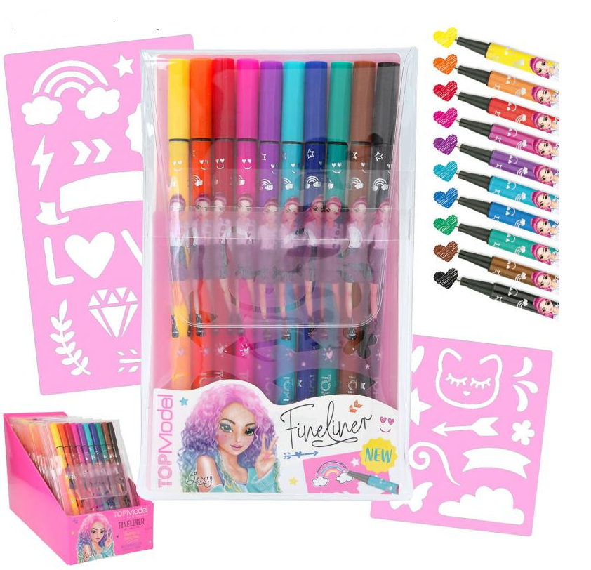 Fijn, fijner, fineliners: de set bestaat uit 10 verschillende fineliners (geel, rood, bruin, oranje, roze, paars, turkoois, groen, blauw, zwart). Tevens ingesloten zijn 2 sjablonen voor handlettering. Alles is verpakt in een transparant tasje.