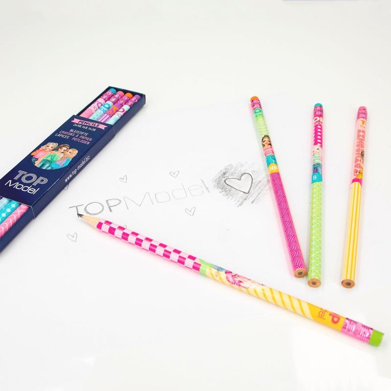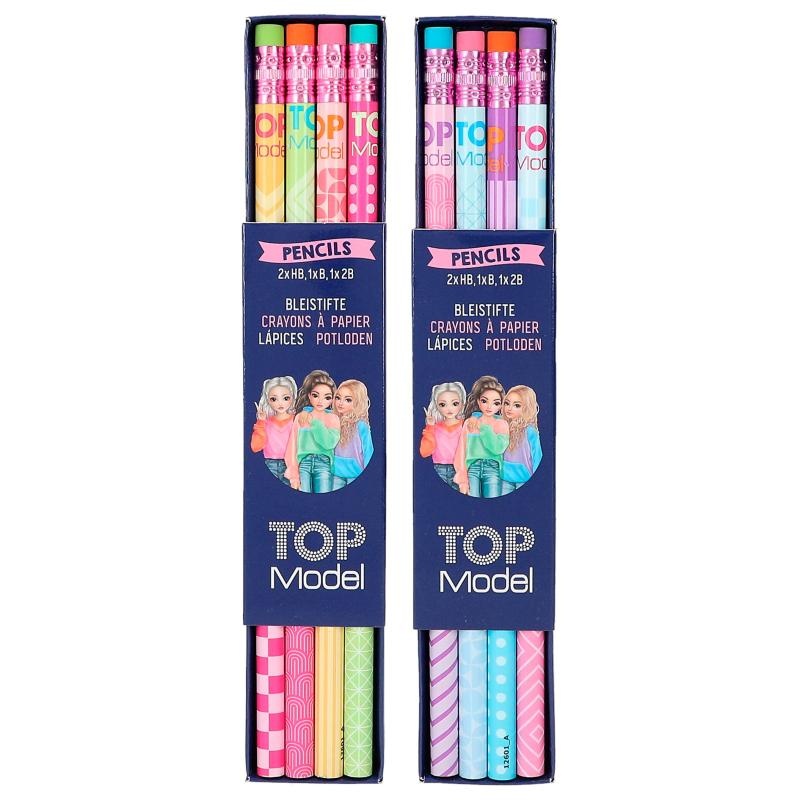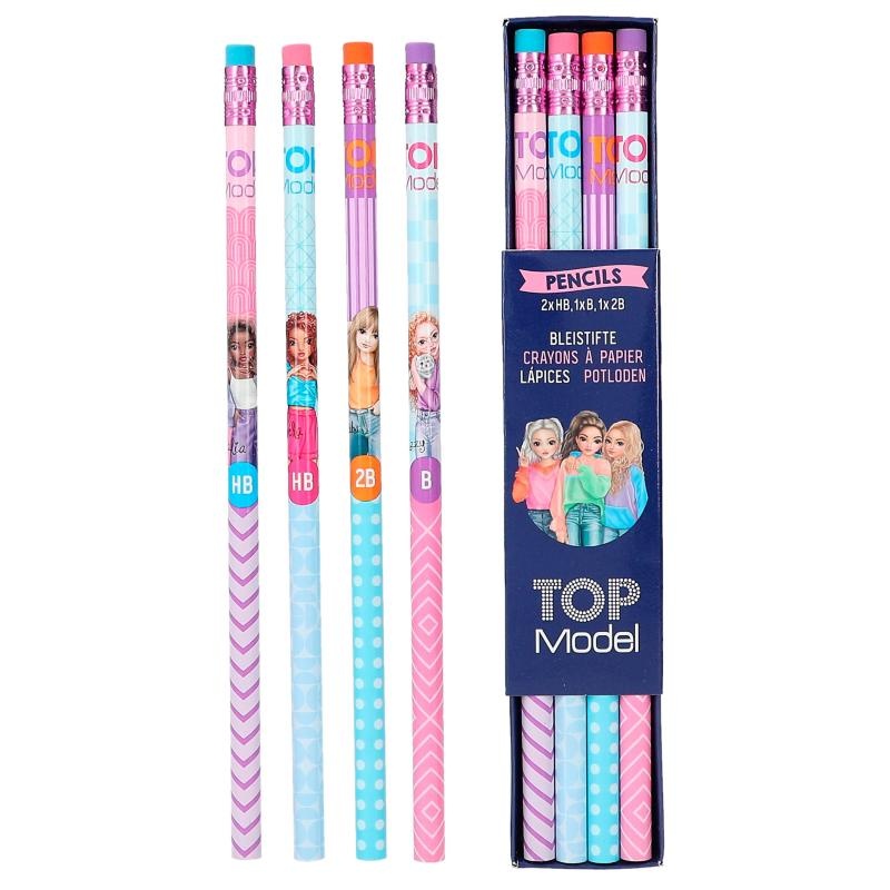 Elk potlood een TOPModel blikvanger. De set bestaat uit vier potloden in een vrolijk design en met prachtige afbeeldingen van modellen. Verschillende hardheden: 2 x HB, 1 x 2B en 1 x B.