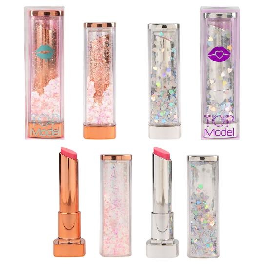 De TOPModel lippenstiften zijn echte confetti blikvangers: de roze lippenstift ruikt naar vanille en heeft een transparante deksel met hartvormige confetti die beweegt.