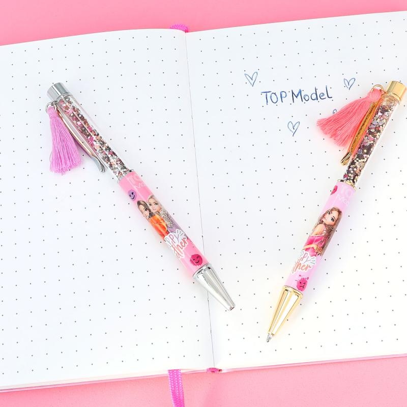 Confetti, kwastjes, TOPModels - een perfecte mix voor een geweldige pen. De pen in twee designs (zilver/roze, goud/paars) heeft een vervangbare blauwe vulling. Cool: het bovenste deel van de pen is transparant en metallic confetti in meerdere kleuren beweegt tijdens het schrijven heen en weer.