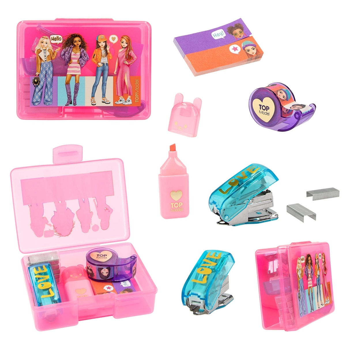 De kleine schrijfwarenset van TOPModel bevat 1 nietmachine met nietjes om na te vullen, 1 plakbandhouder met 4 meter vrolijk bedrukt tape, 2 kleine blokjes met plakmemo's en een tekstmarker. Twee designs: paars met een leuke afbeelding van een model en kat op de deksel en katten op de verschillende onderdelen en een roze marker. De andere is paars met coole modellen op de deksel en de inhoud en met een oranje marker. Nietjes: 10 mm breed, 5 mm hoog.