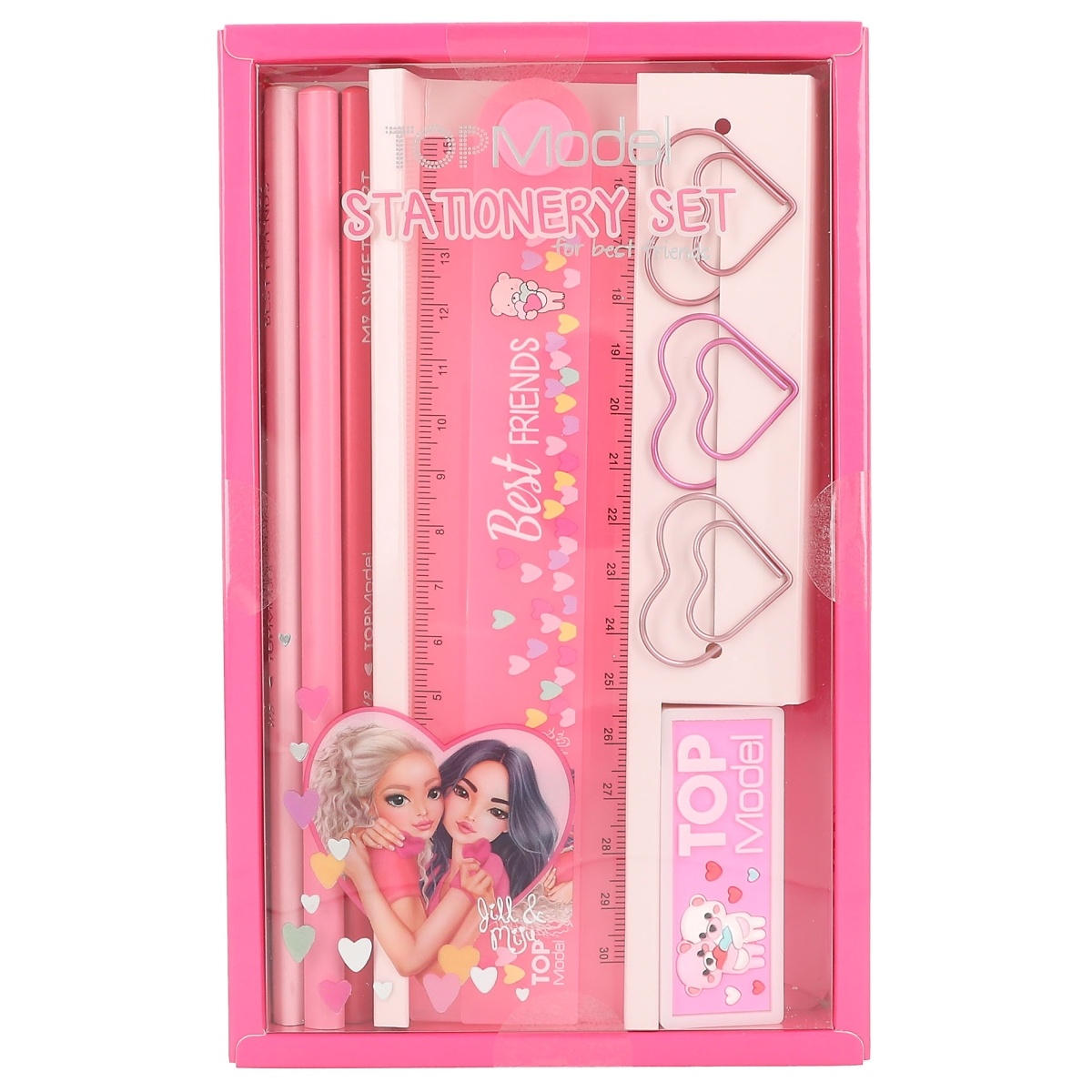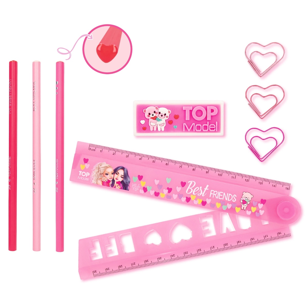 De TOPModel schrijfwarenset voor beste vriendinnen: 3 potloden in hartvorm (HB), een klapbare, vrolijk bedrukte liniaal (30 cm) met sjablonen, drie paperclips in hartvorm en een rechthoekige gum met schattige teddy print. Alles in roze kleuren.