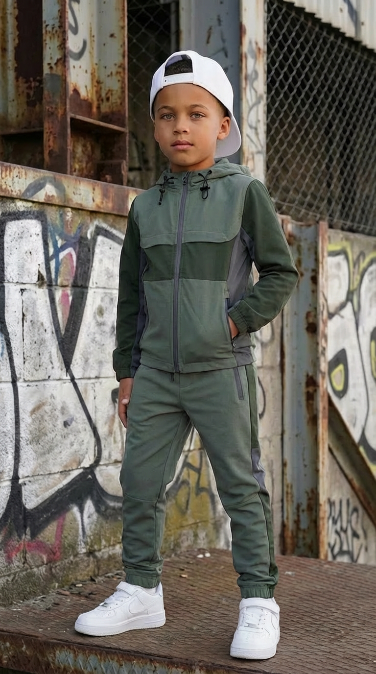 Dit stoere trainingspak is perfect voor jongens die houden van comfort en een trendy streetstyle look. De set bestaat uit een hoodie met ritssluiting en een bijpassende joggingbroek, ideaal voor elke dag.