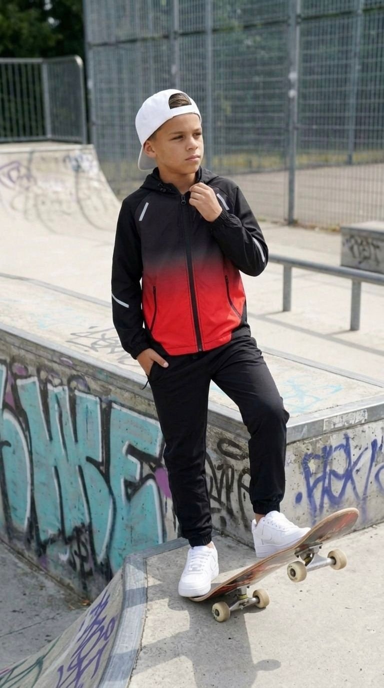 Deze stijlvolle zwarte trainingsset is een echte musthave voor actieve kids. De set bestaat uit een vest met rits en capuchon, gecombineerd met een bijpassende broek met elastische tailleband en boorden aan de enkels. De kleur zorgt voor een rustige, trendy uitstraling en is makkelijk te combineren.