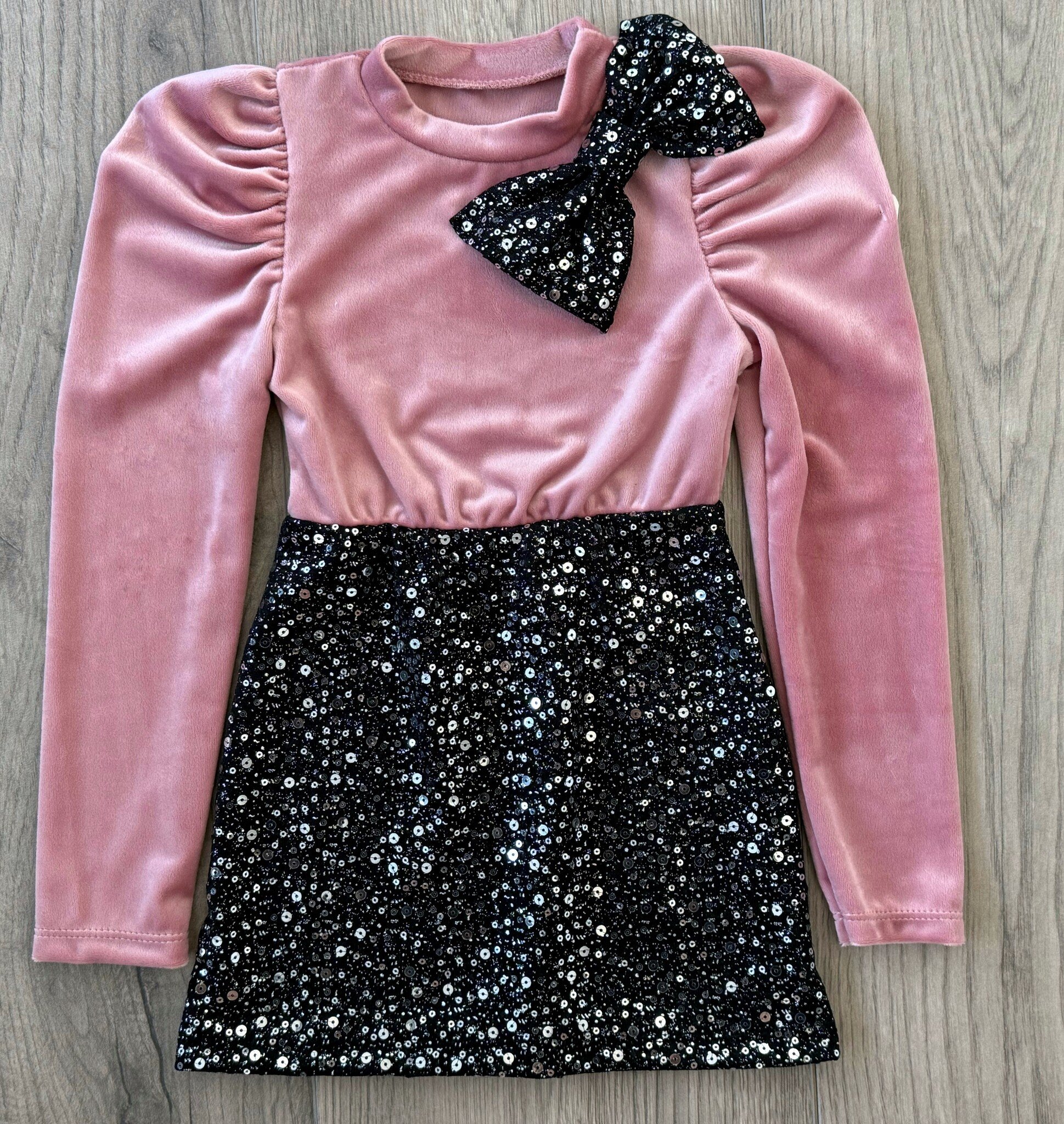Laat je meisje stralen in dit stijlvolle kerst glitter jurkje! Het jurkje combineert een zacht roze velvet bovenstuk met elegante pofmouwtjes en een opvallende zwarte glitter rok. De bijpassende strik maakt het geheel feestelijk en speels.