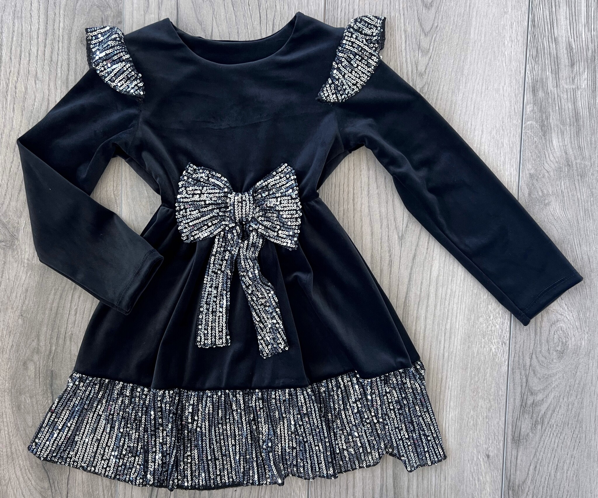 Feestelijk velvet jurkje voor meisjes in zwart met zilveren sequins en strik. Perfect voor kerst, oud & nieuw en andere feestdagen. Maat 86/92 t/m 134/140