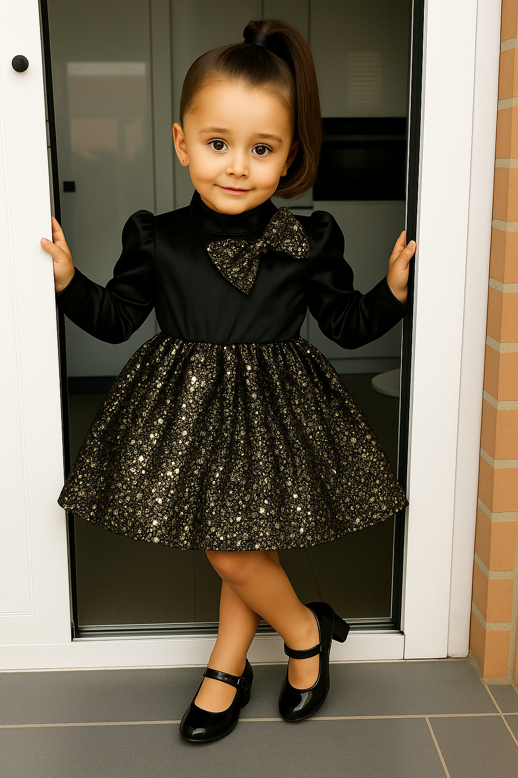 Stijlvol kerstjurkje voor meisjes! Velvet bovenstuk met pofmouw, gouden glitter rok en grote strik. Perfect voor de feestdagen. Maat 86 t/m 140.