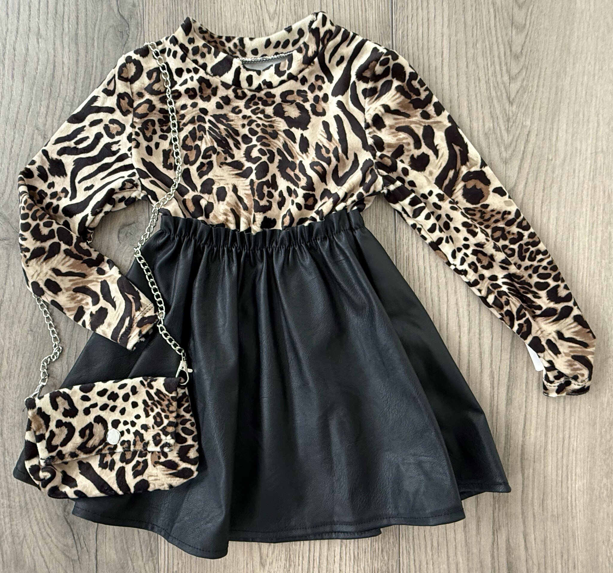 Trendy luipaardjurkje met velvet top, leatherlook rok en gratis bijpassend tasje. Perfect voor stoere en stijlvolle meiden.