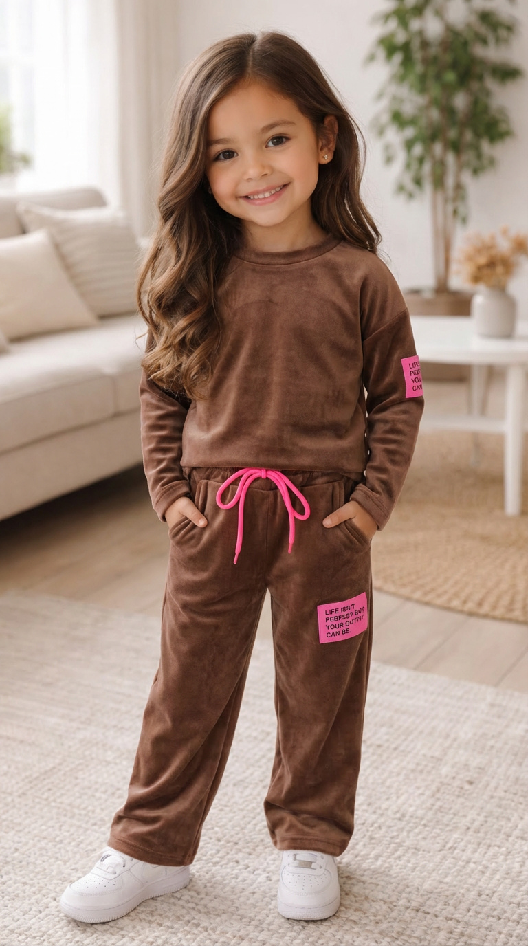Dit tweedelige meisjes setje is een echte eyecatcher! Zowel het lange mouwen shirt als de flared broek hebben een stoere roze label met de tekst: "Life isn’t perfect but your outfit can be." Het setje is gemaakt van een zachte, comfortabele stretchstof – ideaal om in te spelen én te shinen.